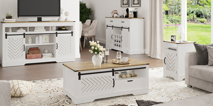 Farmhouse Coffee Table with Storage and Sliding Barn Door, 48'' Rustic Living Room Table , Rectangular Center Table