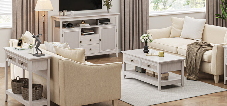 Superjoe TV Stand for TVs up to 70", 34" Tall Entertainment Center w/Sliding Doors, Modern Wood Media Console Storage Cabinet for Living Room Bedroom, Wood-Tone and White