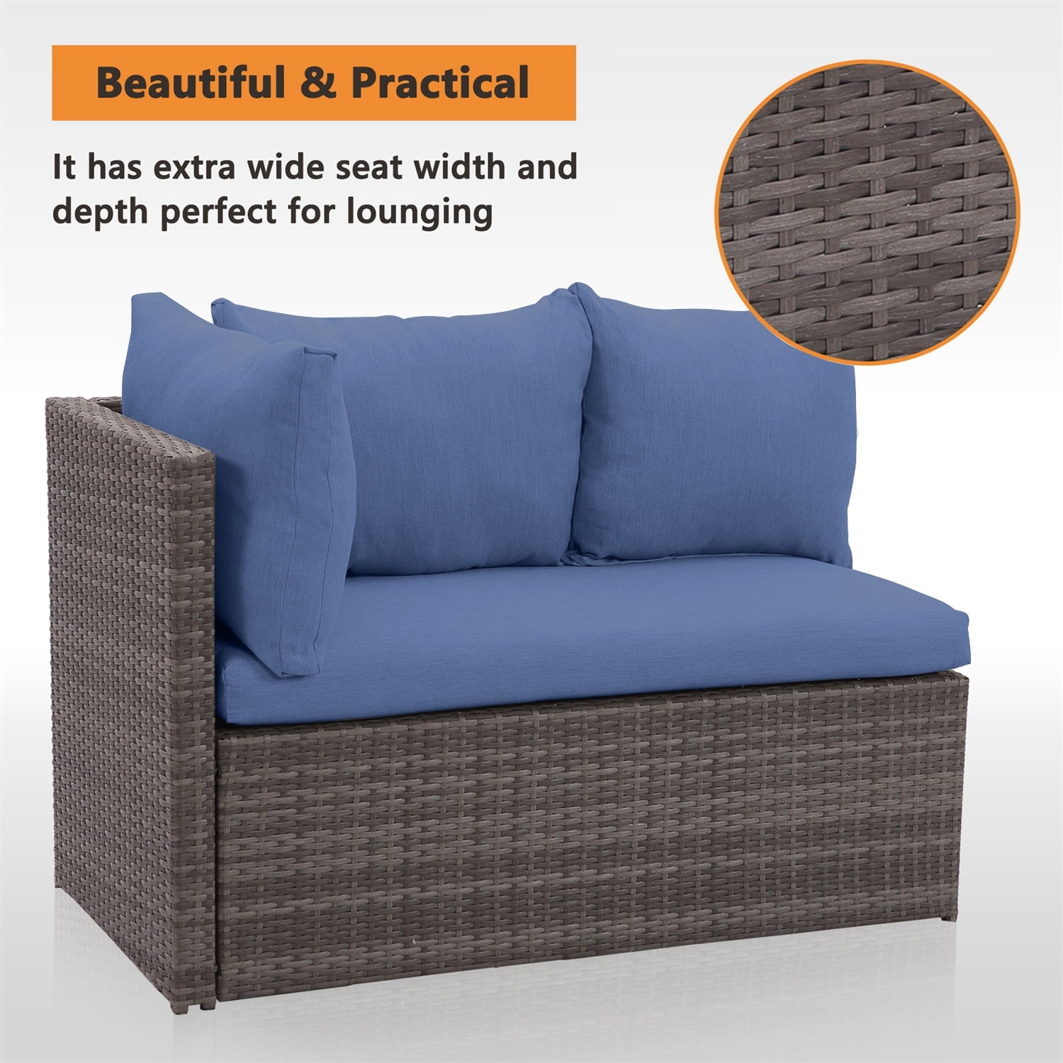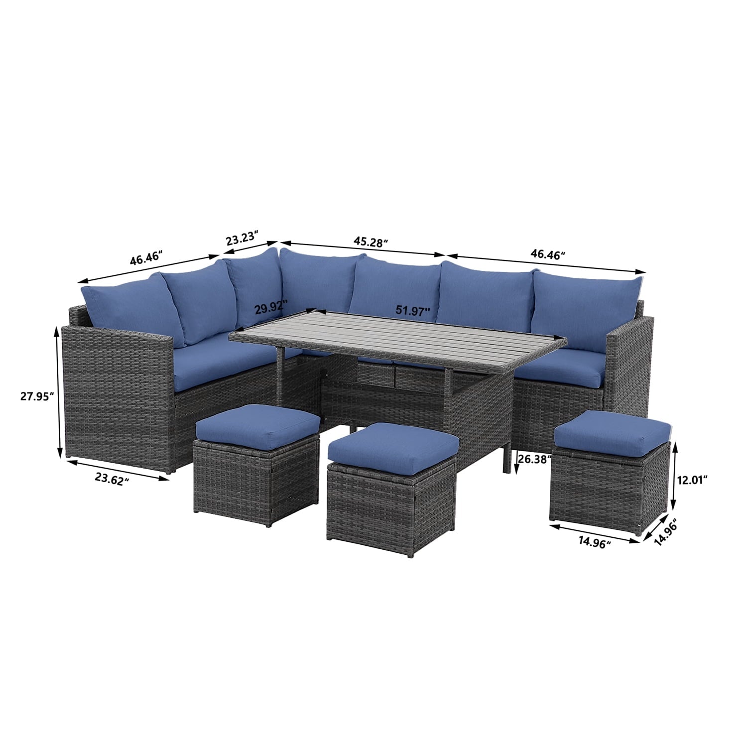 CozyHom 7 Pcs Modern Outdoor Patio PE Wicker Rattan Conversation Sofa Furniture Set, Sectional Furniture Couch Sets with Dining Table and Cushions, Blue