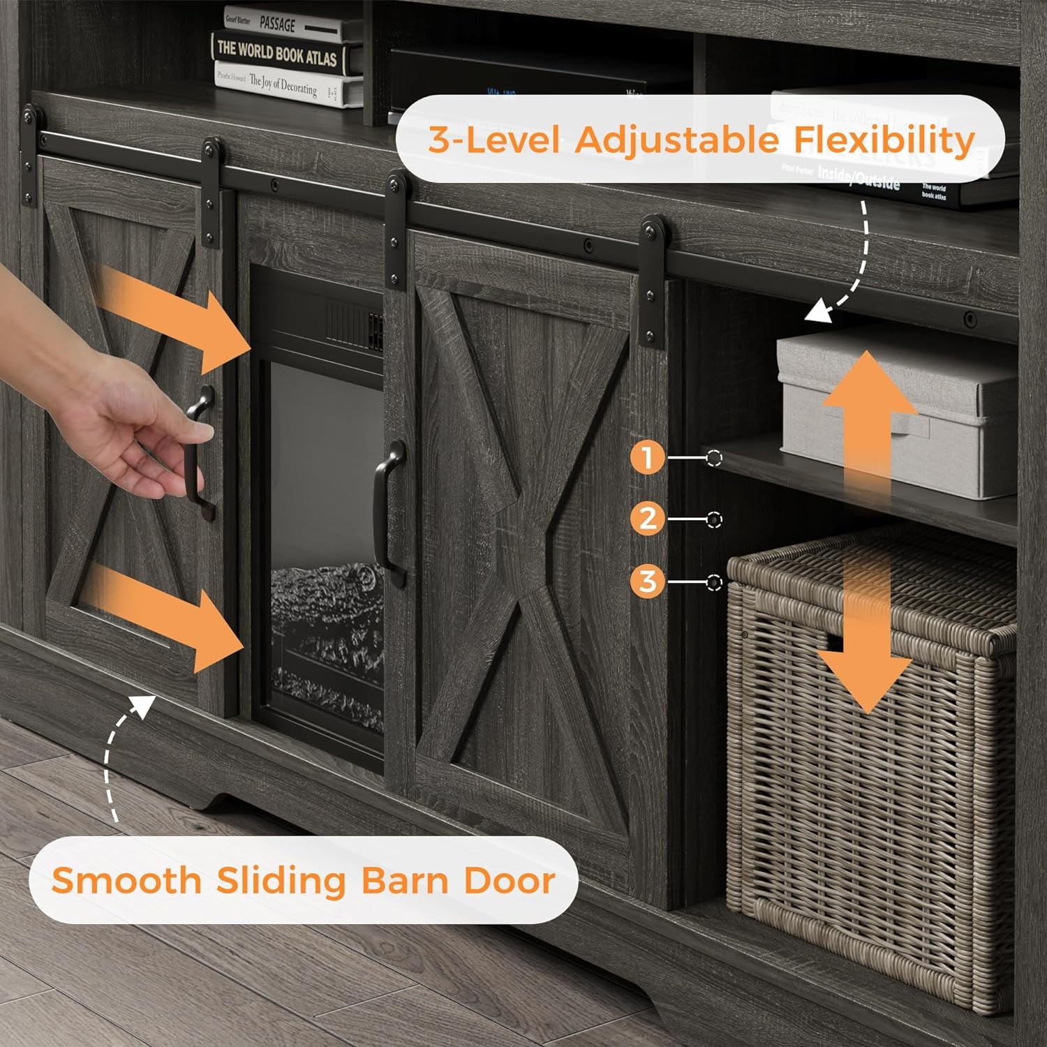 CozyHom Electric Fireplace TV Stand for 65+ Inch TV, Farmhouse Entertainment Center with 23" Electric Fireplace with Remote, Modern Rustic TV Console with Sliding Bar Door for Living Room, Gray