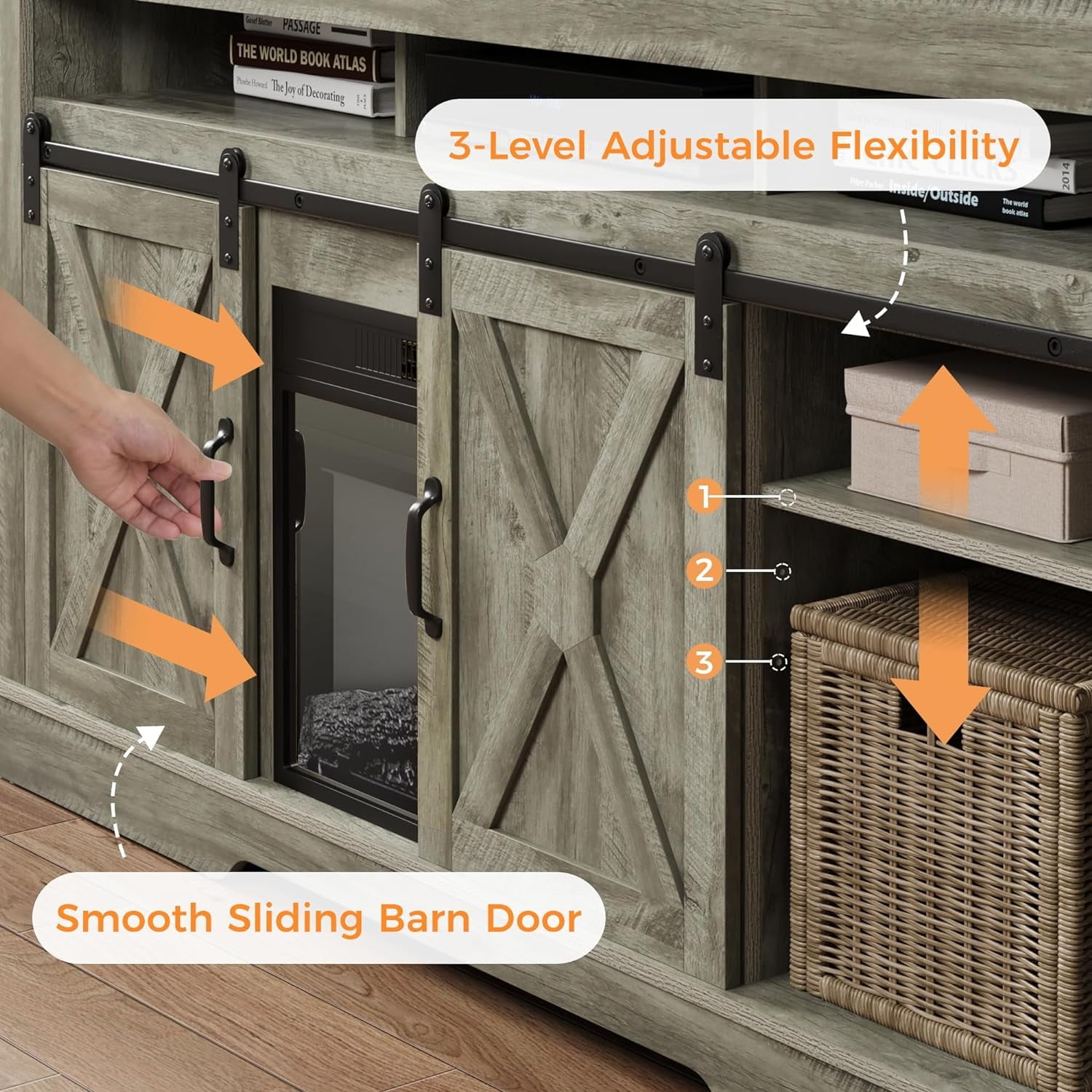CozyHom Electric Fireplace TV Stand for 65+ Inch TV, Farmhouse Entertainment Center with 23" Electric Fireplace with Remote, Modern Rustic TV Console with Sliding Bar Door for Living Room, Light Gray