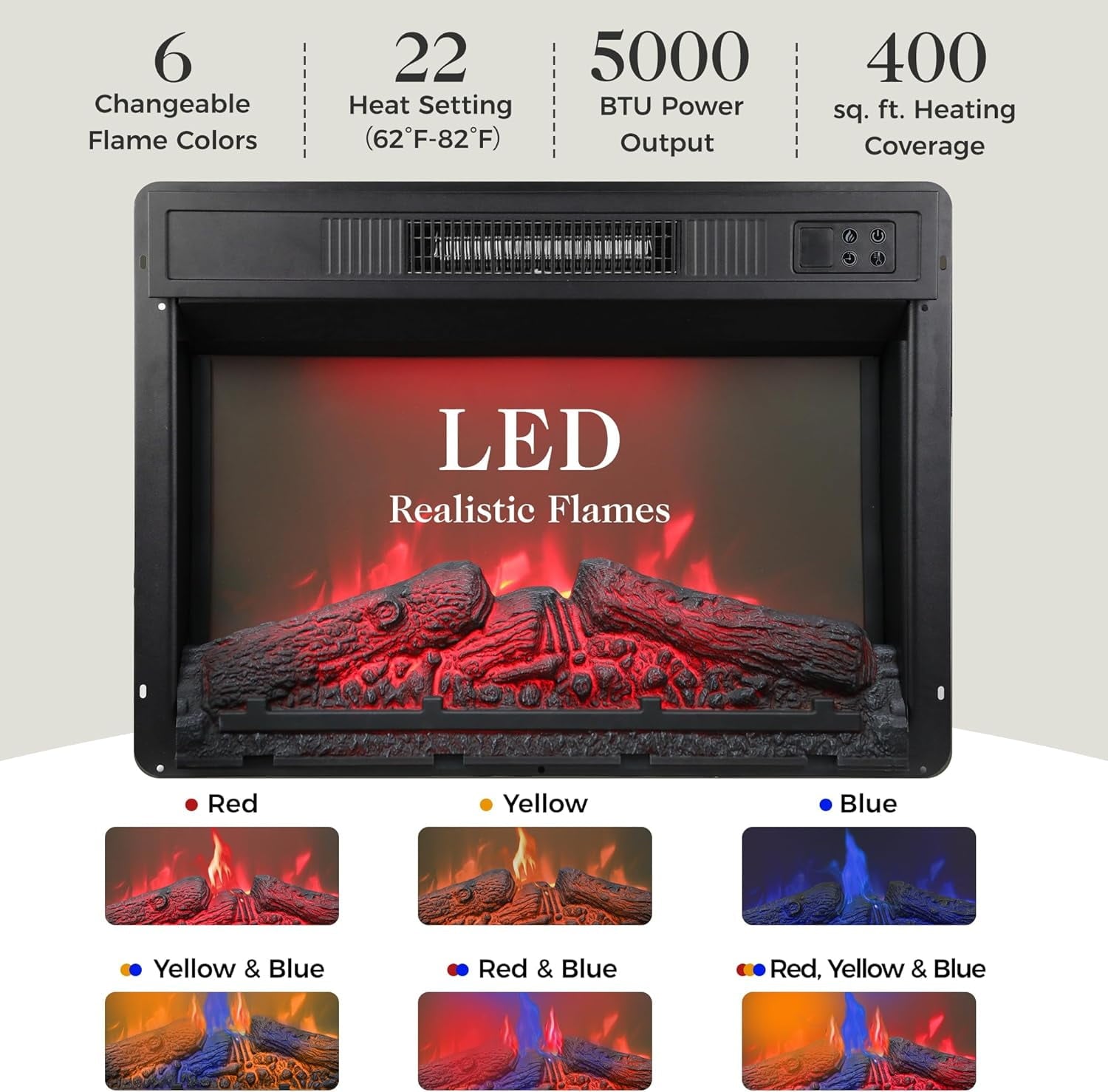 - Customizable Flames and Adjustable Temperature: Our LED electric fireplace pumps out 5000 BTU, wrapping a 400 sq. ft. area in warmth. Enjoy 6 captivating flame hues, 3 brightness levels, and 22 temperature options that grant you full coziness control.