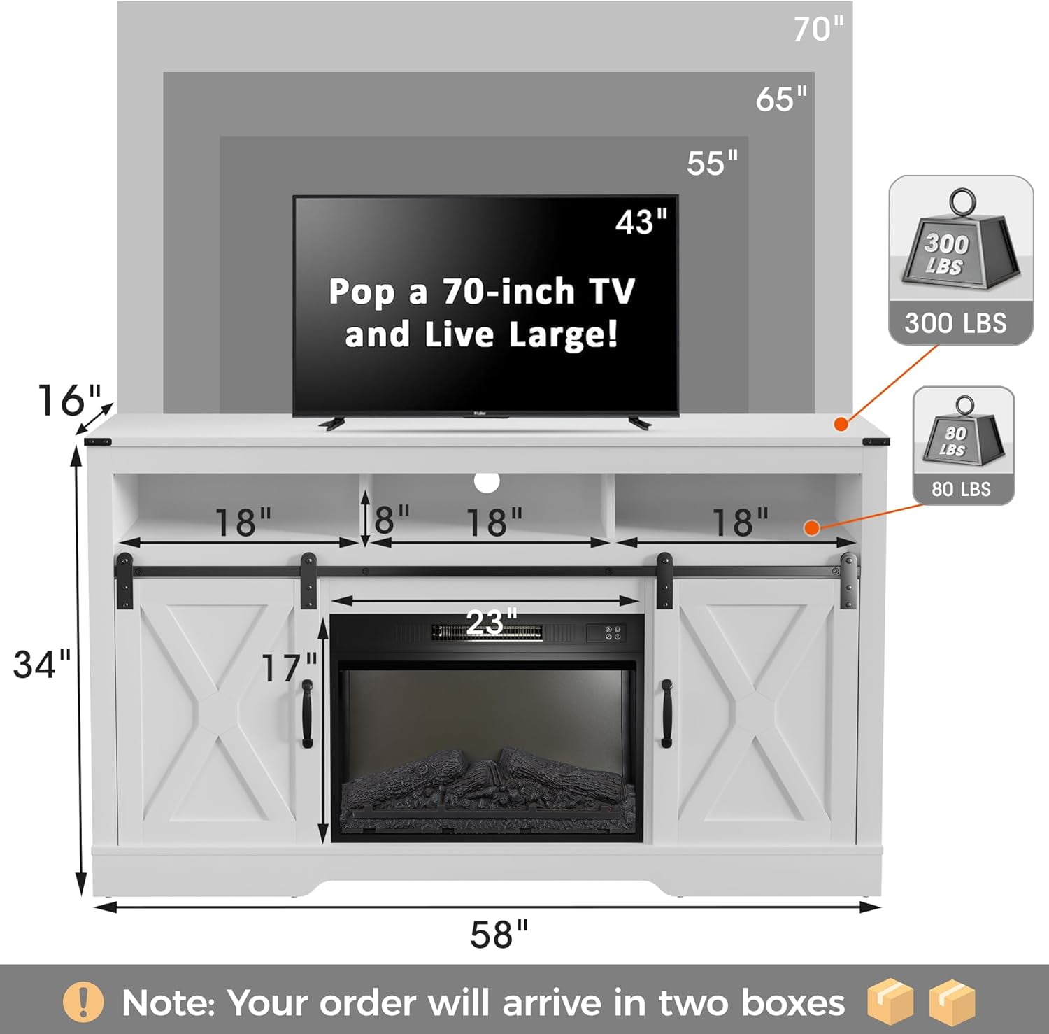 CozyHom Electric Fireplace TV Stand for 65+ Inch TV, Farmhouse Entertainment Center with 23" Electric Fireplace with Remote, Modern Rustic TV Console with Sliding Bar Door for Living Room, White