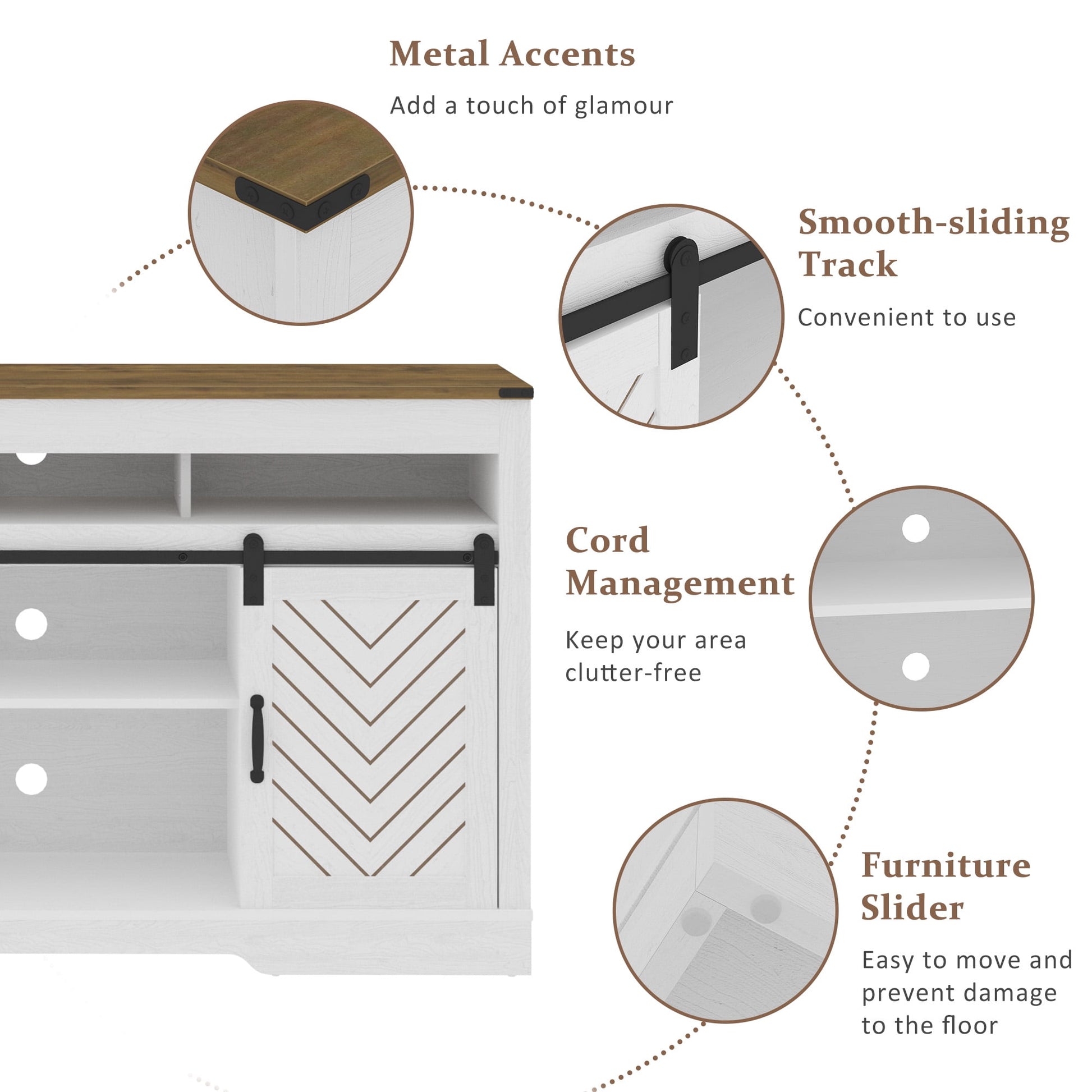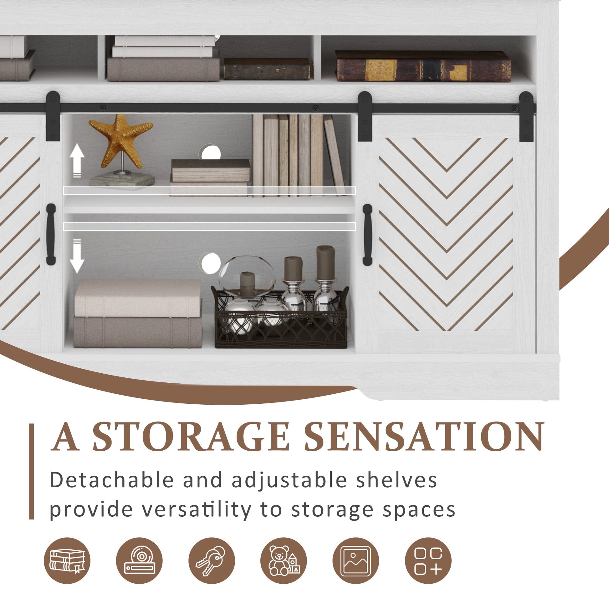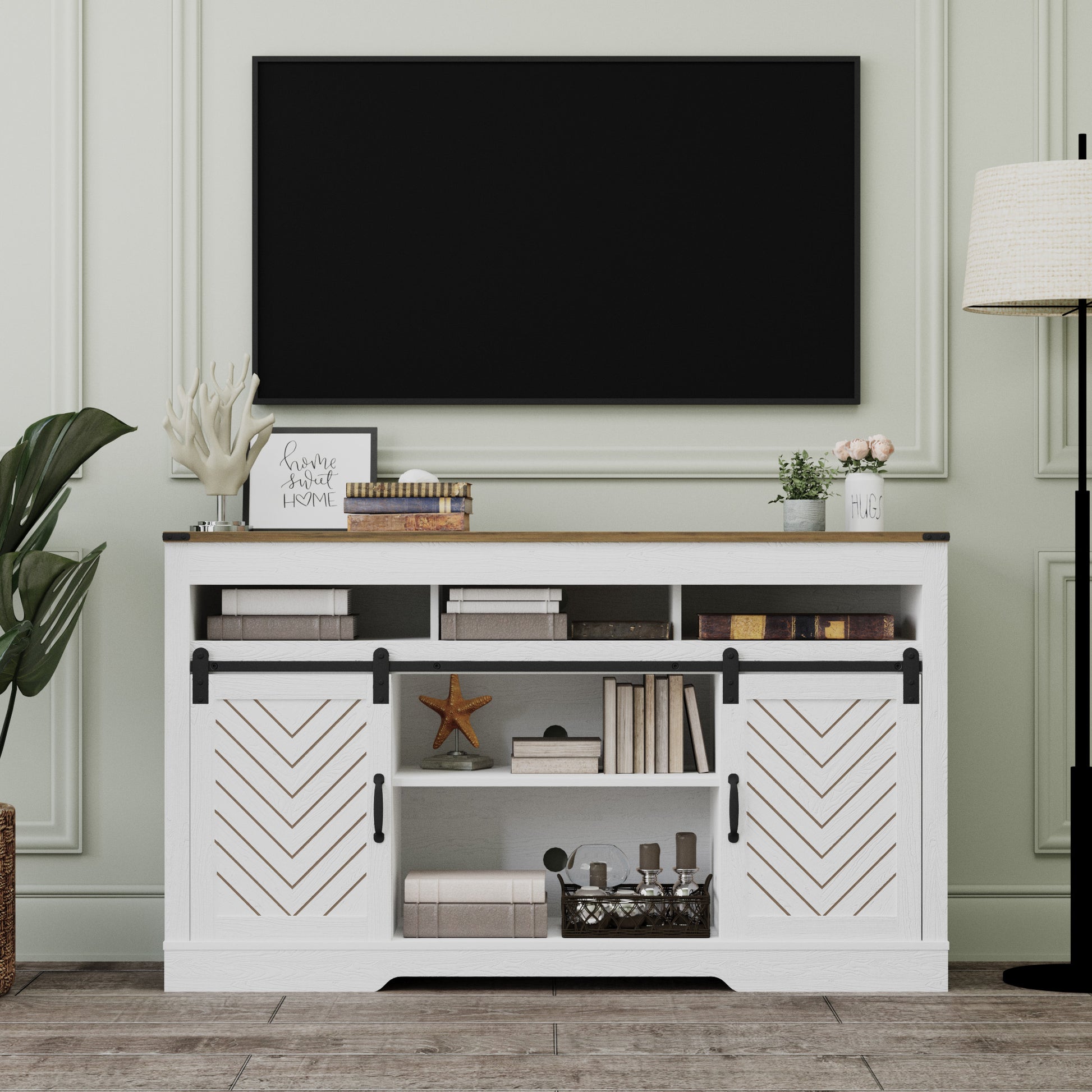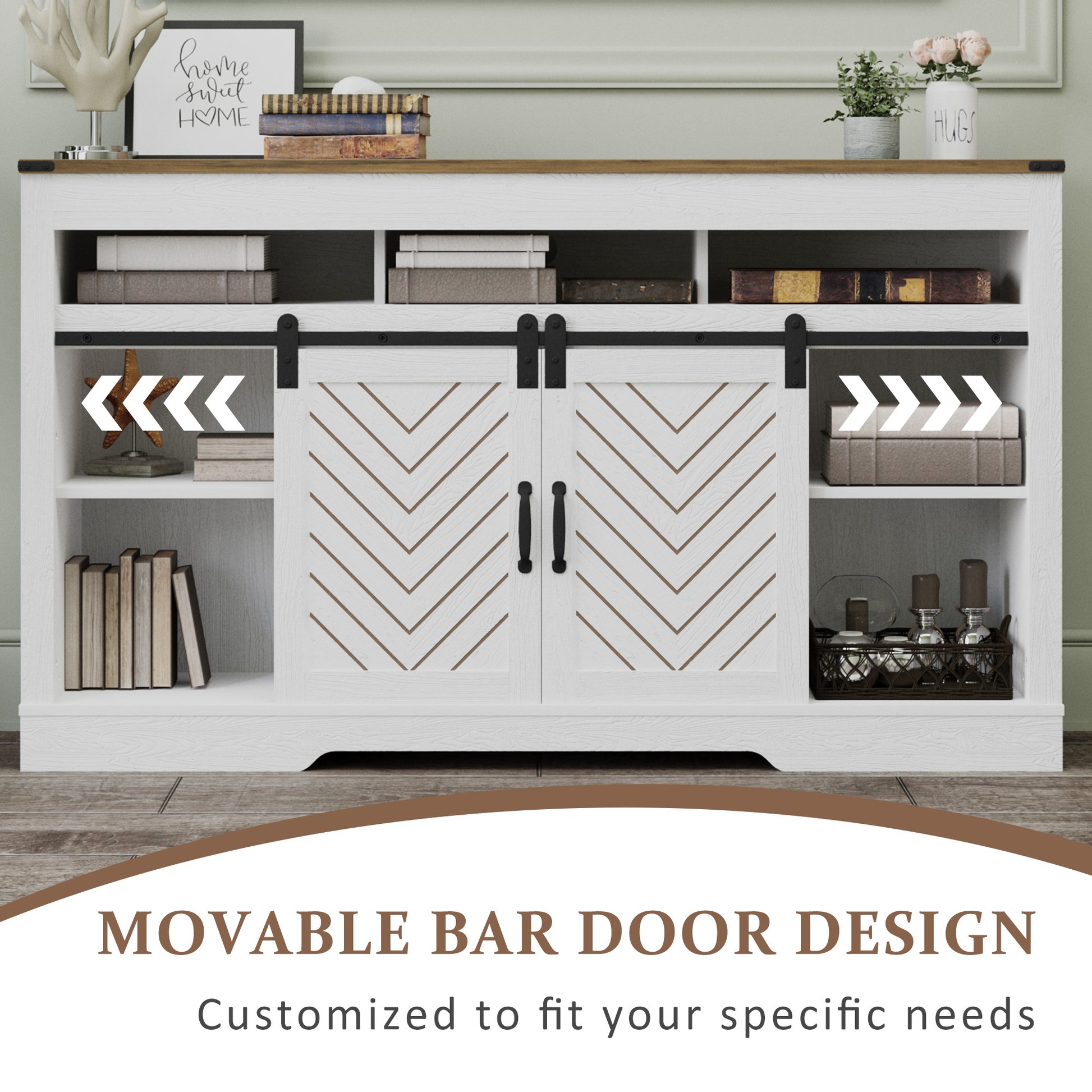 Cozy Home 58" Wooden Barn Door TV Cabinet with triple color blocking storage double sliding door design, large storage space, traditional vintage color, unique flavor, perfect blend with your home decoration, pleasing to the eye. The TV cabinet is just the right size, not taking up extra space but allowing for a lot of storage space.