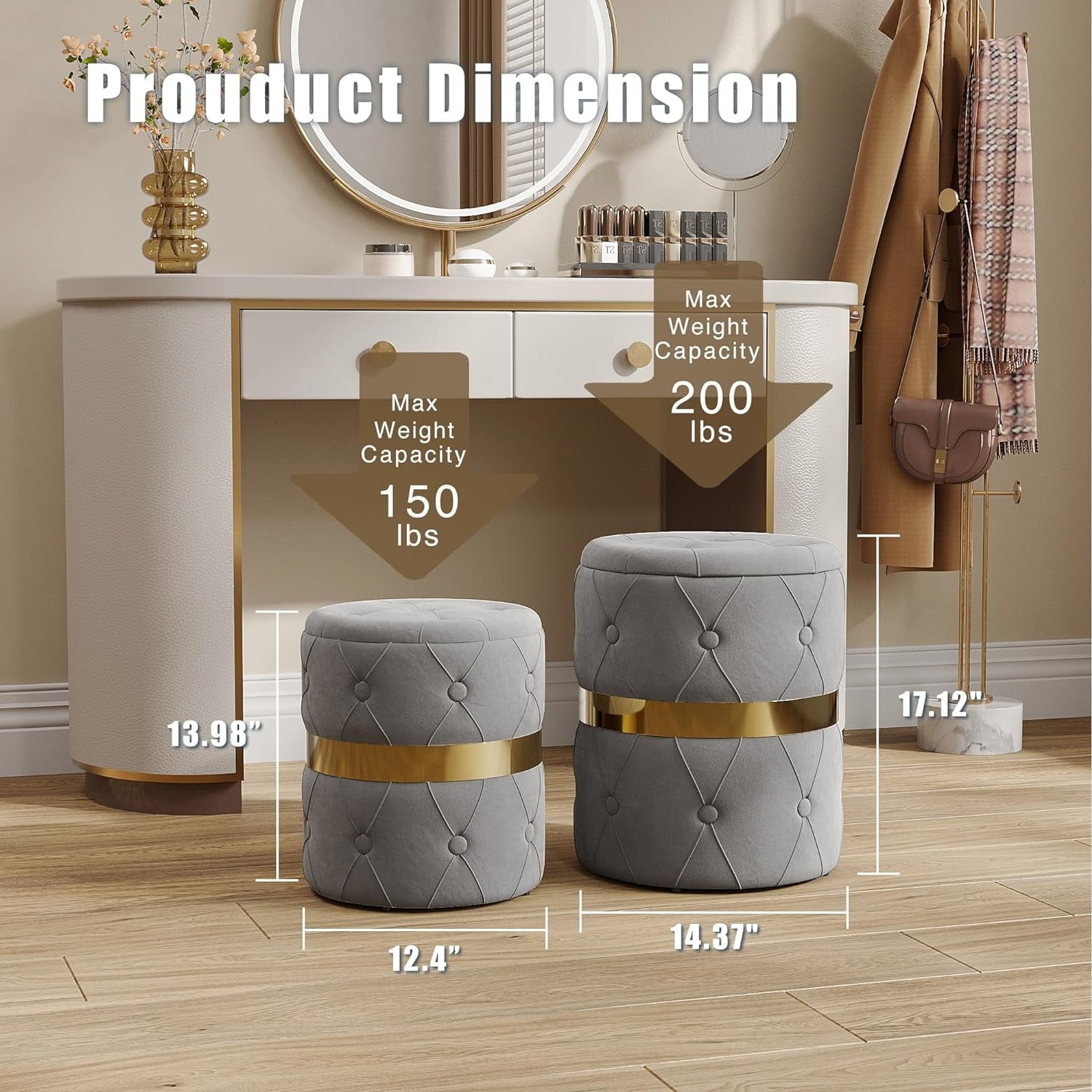 CozyHom Storage Ottoman Set of 2, Versatile Footrest Stool with Stainless Steel Base, Modern Round Vanity Stool Chair Foot Stools, Support 200lbs Padded Seat, for Living Room, Bedroom, Grey