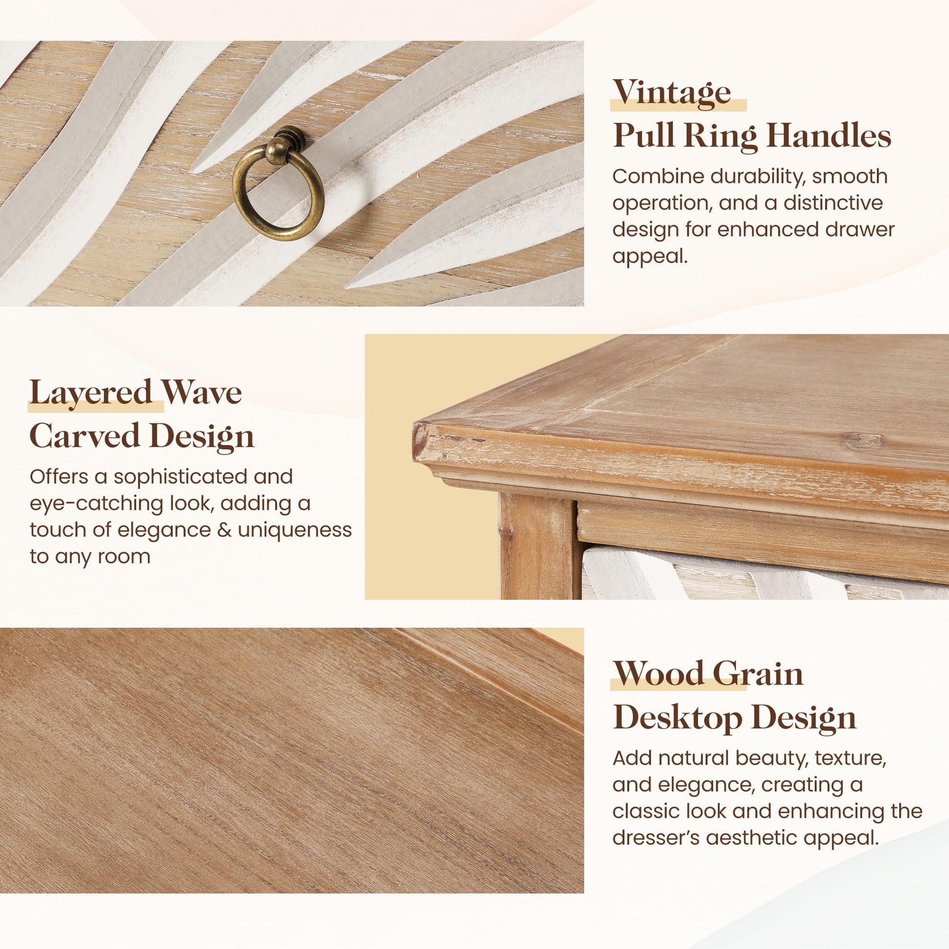 - Vintage and Fashionable Design: The vintage-style color-blocked design, complemented by gourd-shaped solid wood legs and intricately carved drawer patterns, makes this wide 3 chest of drawer a charming addition to any space. Its classic natural color exudes elegance, ensuring it stands out as a stunning decorative piece in any home environment, effortlessly enhancing your interior decor.
