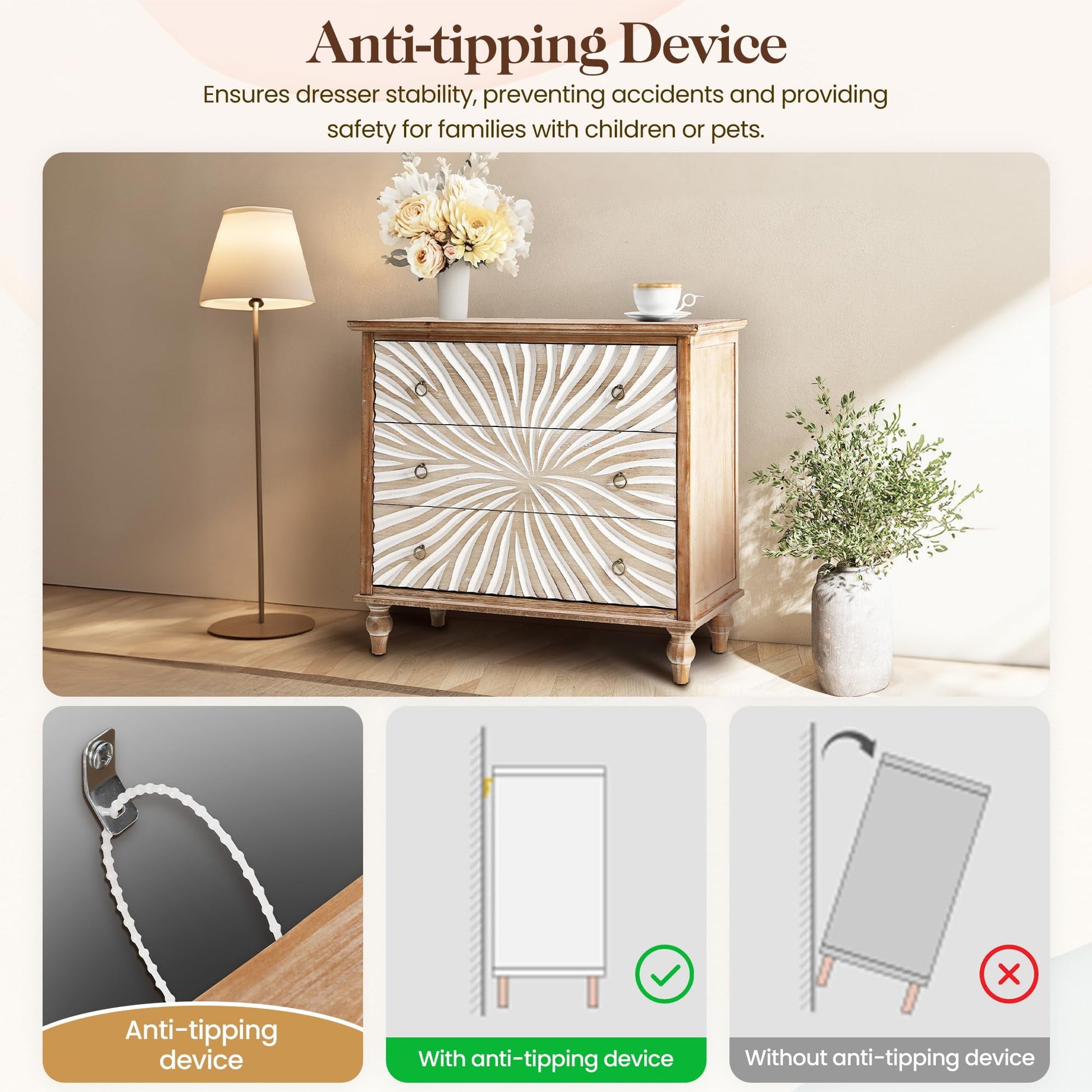 ?- Quality and Reliable Materials: Our vintage 3 drawer dresser is constructed with MDF side panels and solid wood frames, ensuring durability and long-term use. The thickened top panel adds to its sturdiness, while the three well-structured drawers, equipped with smooth slides, provide a seamless user experience. An additional anti-tipping kit is included for added safety, making this table a reliable solution for keeping small items organized and your room tidy.