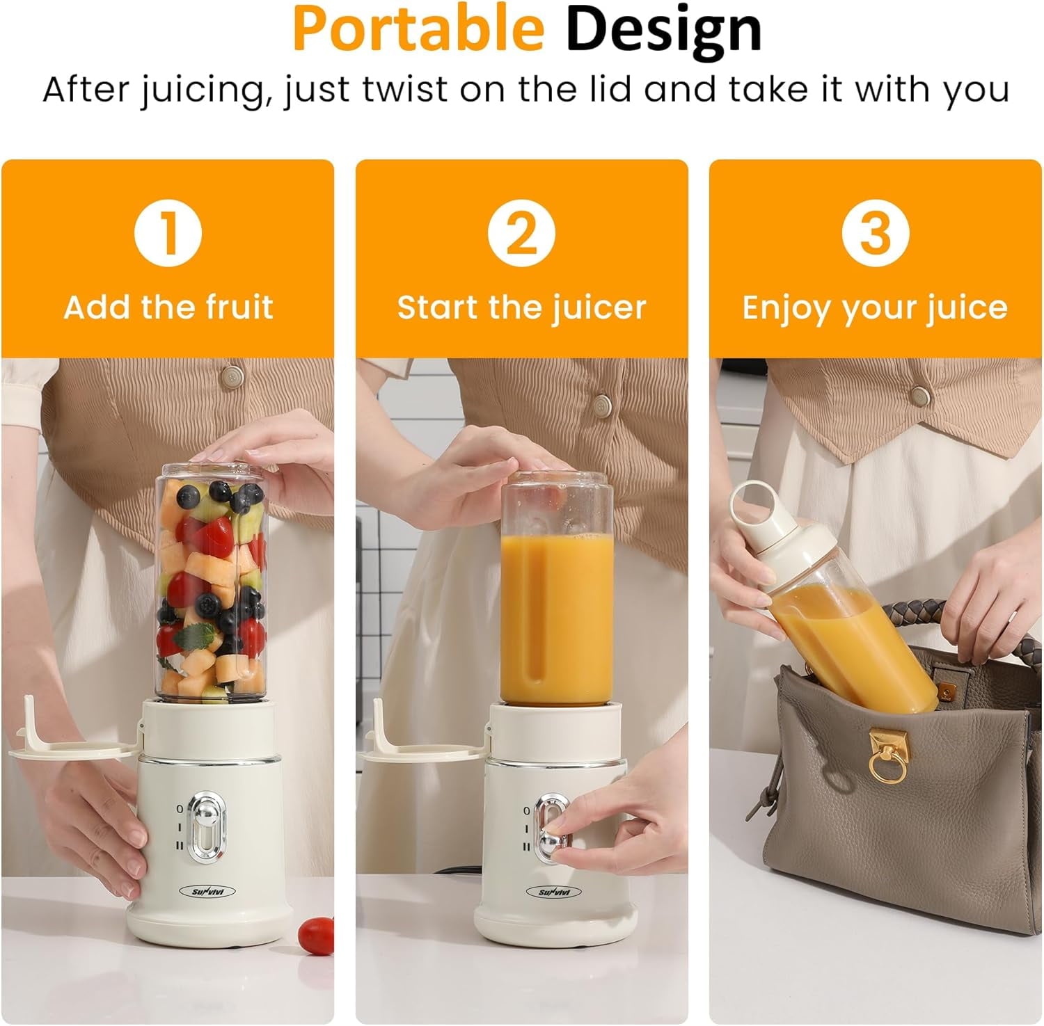 - ¡¾Portable Design¡¿-Equipped with a portable blending cup, this blender offers exceptional convenience by letting you blend juice directly into the cup. After juicing, simply twist on the lid and take it with you, eliminating the need for extra containers. Perfect for a busy lifestyle, it ensures you can enjoy fresh, healthy juice on the go.
