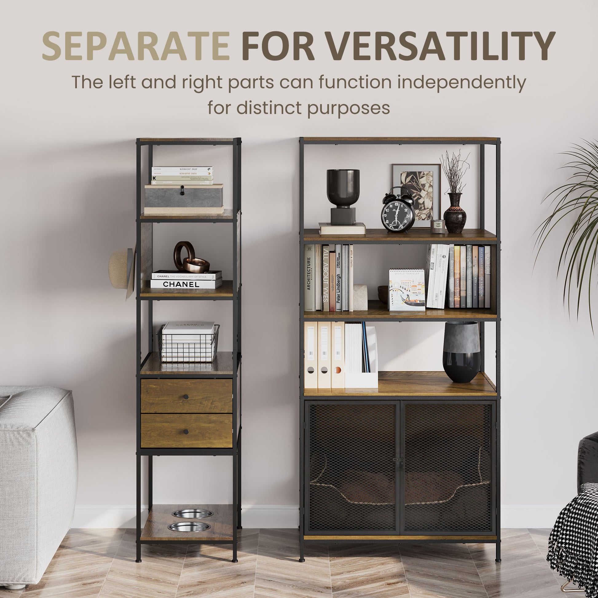 - Free-standing Design: Left and right parts can be used completely separately, flexible to adapt to a variety of different spaces. Whether you use it as a bookshelf with storage in your study room or a dog crate in your living room, this is a great choice.