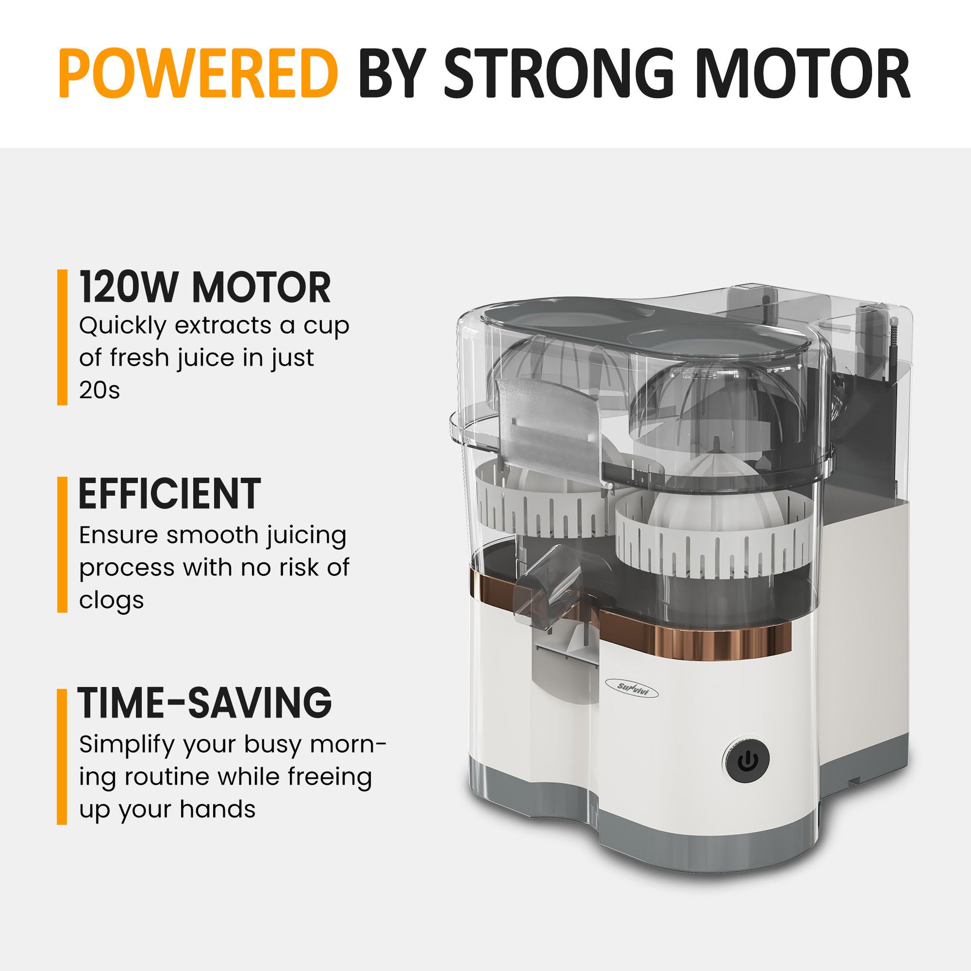 Dual Heads, Double the Juice: With its innovative double-headed design, this juicer lets you juice 2 fruit halves simultaneously, boosting efficiency and saving time. Whether you prefer a quick, single-fruit juice or want to blend 2 different fruits, this versatile juicer delivers. Enjoy a delightful, refreshing juice experience every time.