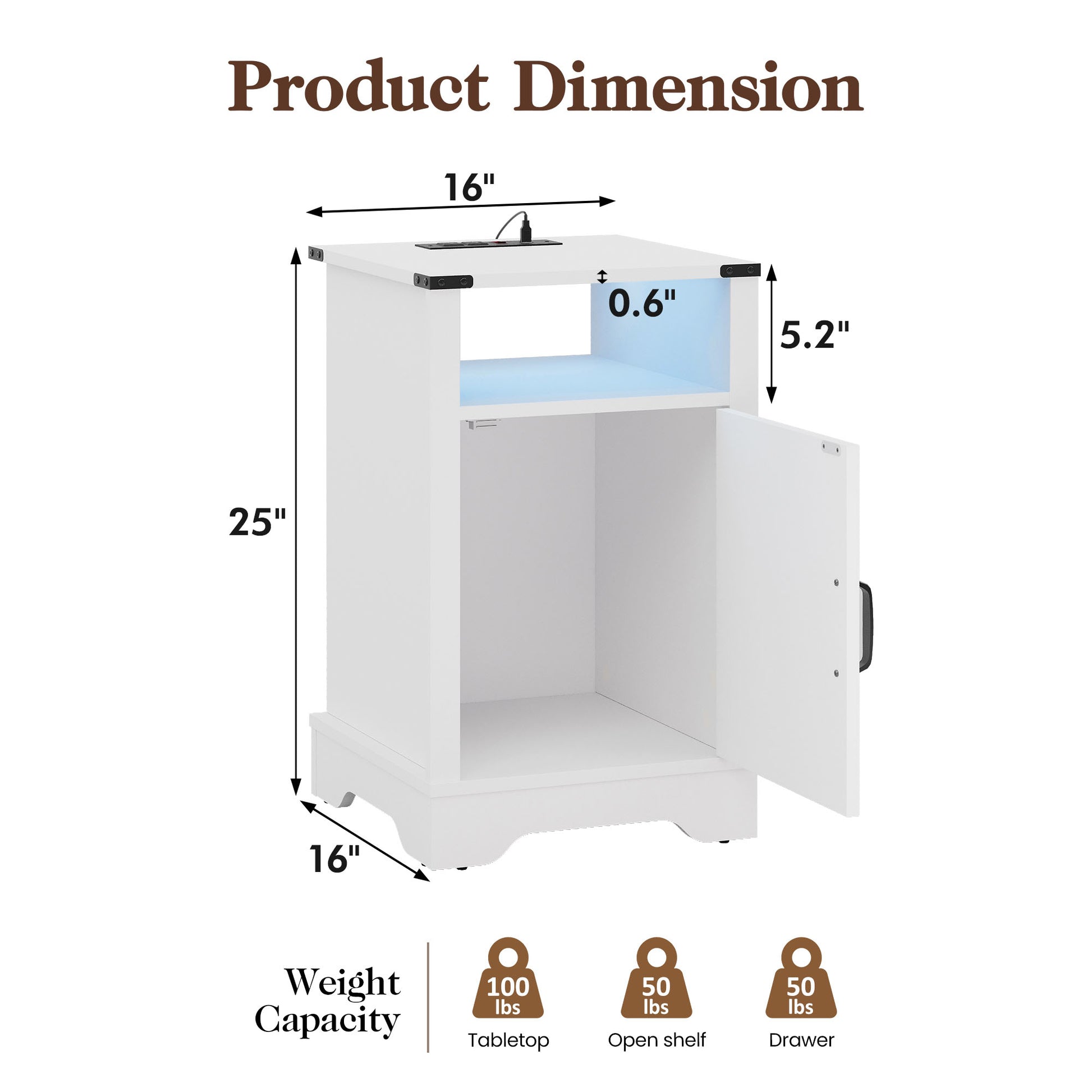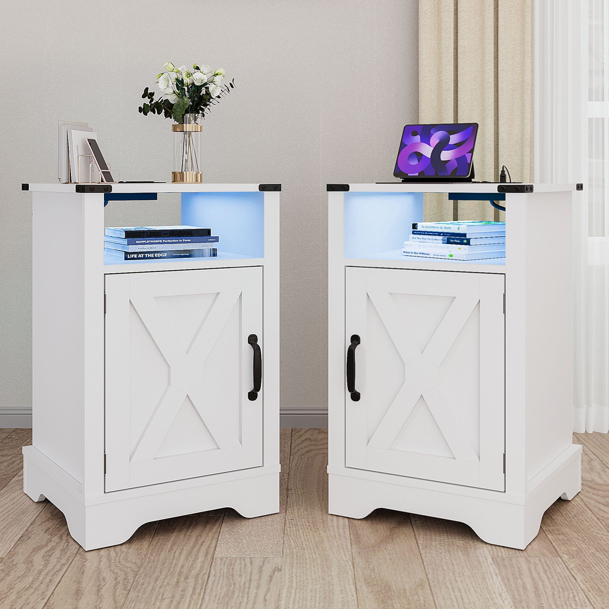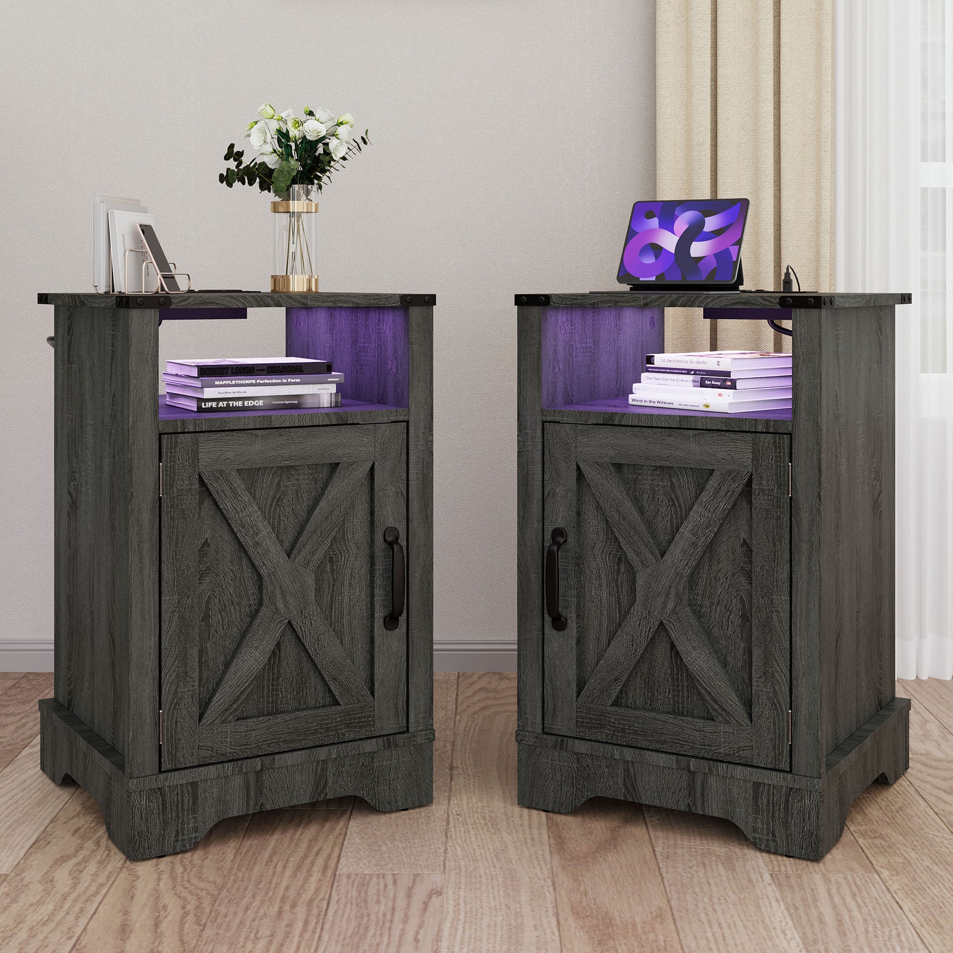 LED Nightstand Set of 2 with Charging Station, Farmhouse Wooden Side Table, Bedside Table with Storage Cabinet and Shelf, Rustic End Table for Bedroom, Living Room