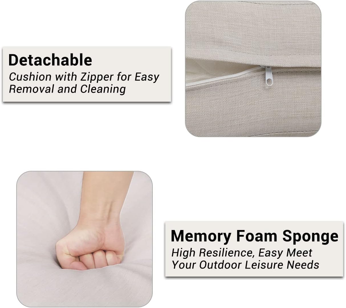IMPECCABLE CUSHION- Its 5” high-density foam cushions make it excellent ergonomic back support outdoor furniture! The structural memory foam provides foundation and shape while the cotton ones tend to slag and flatten over time. Wrapped in durable, water-resistant Olefin fabric, the patio furniture sets’ cushions pad both seat and back for ultimate comfort.