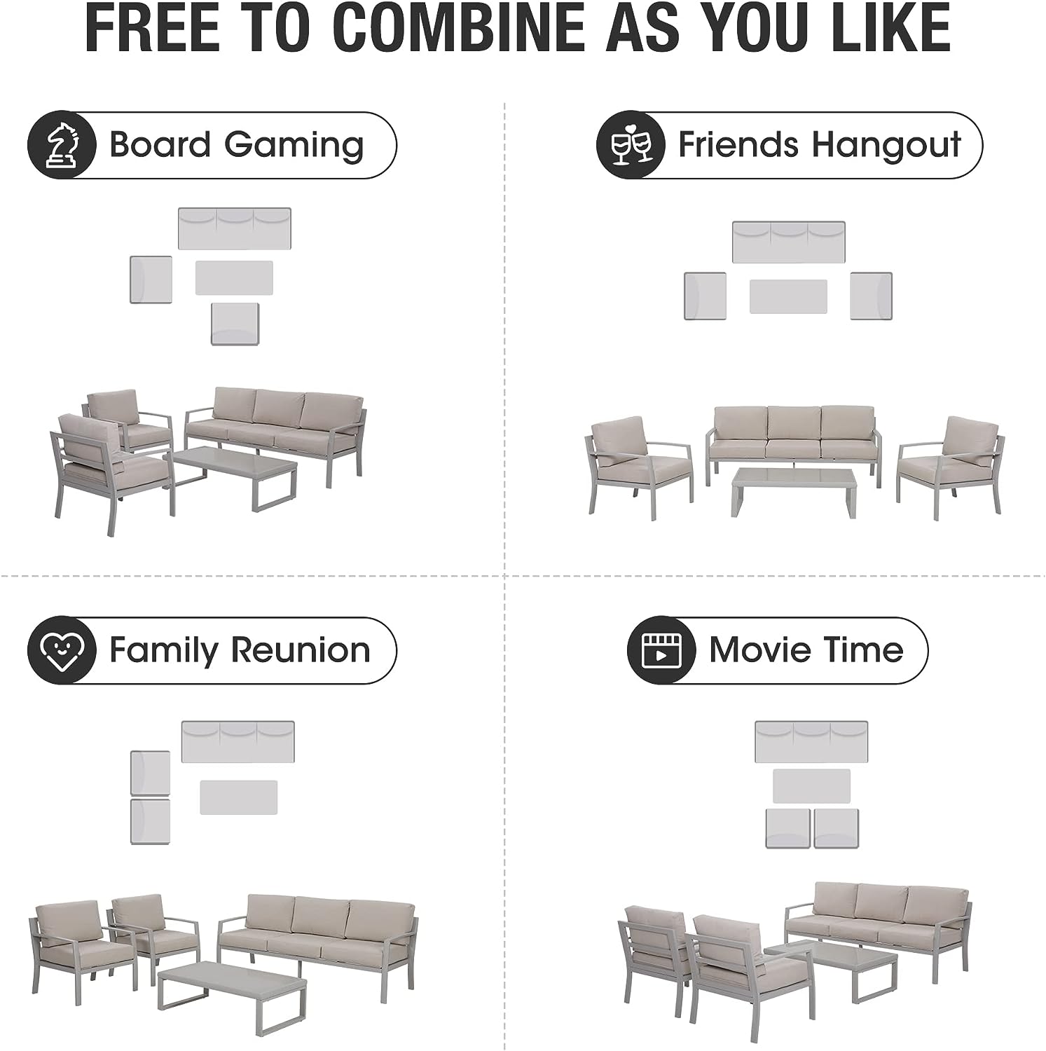 VERSATILE DESIGN- This modern outdoor furniture features a sectional design that can break into 2 armchairs, a 3-seat sofa couch, and a coffee table, so there’s plenty of room for backyard barbecues, friend movie nights, and family get-togethers. You can easily recombine it to suit your places for the outside patio furniture will make a statement in all shapes and sizes.