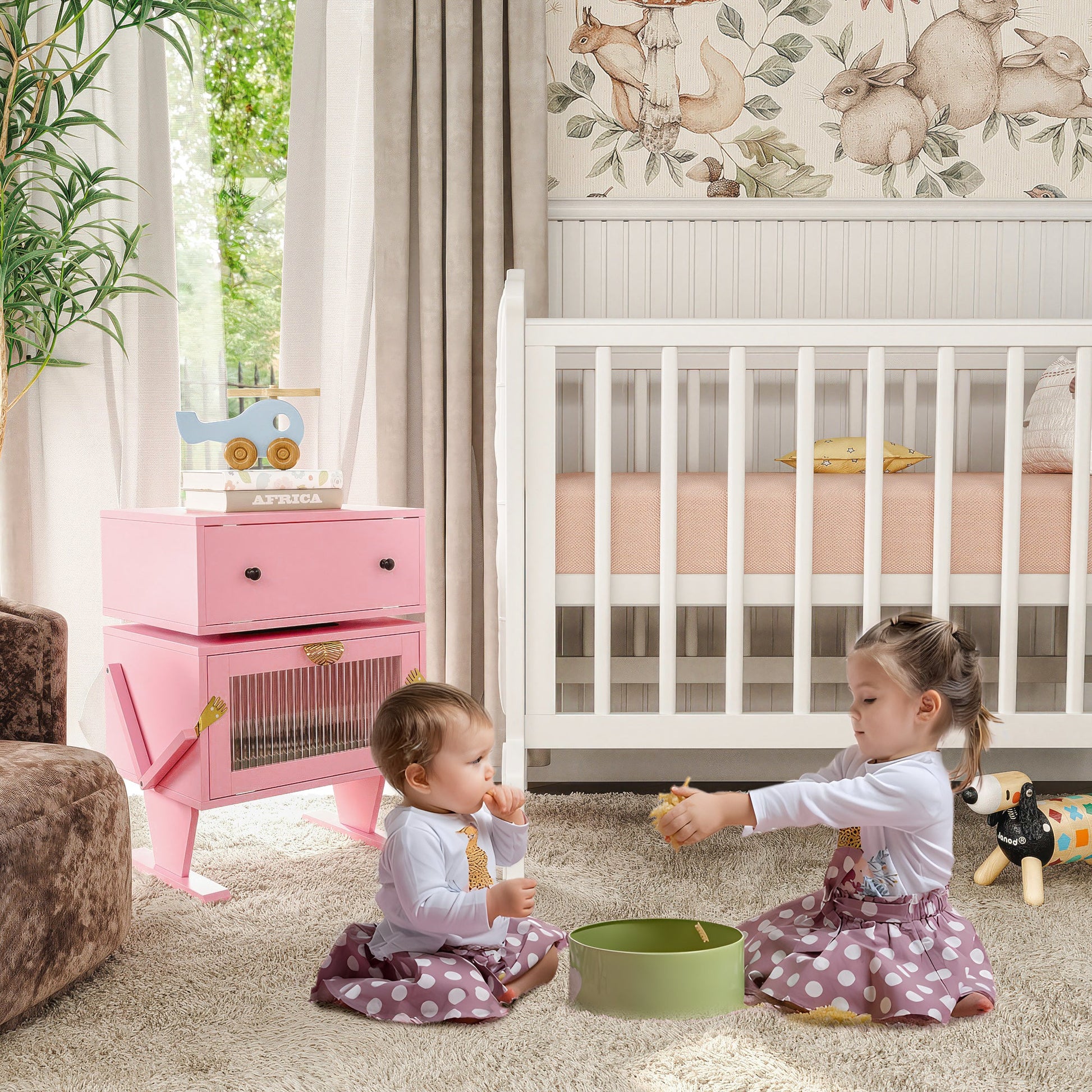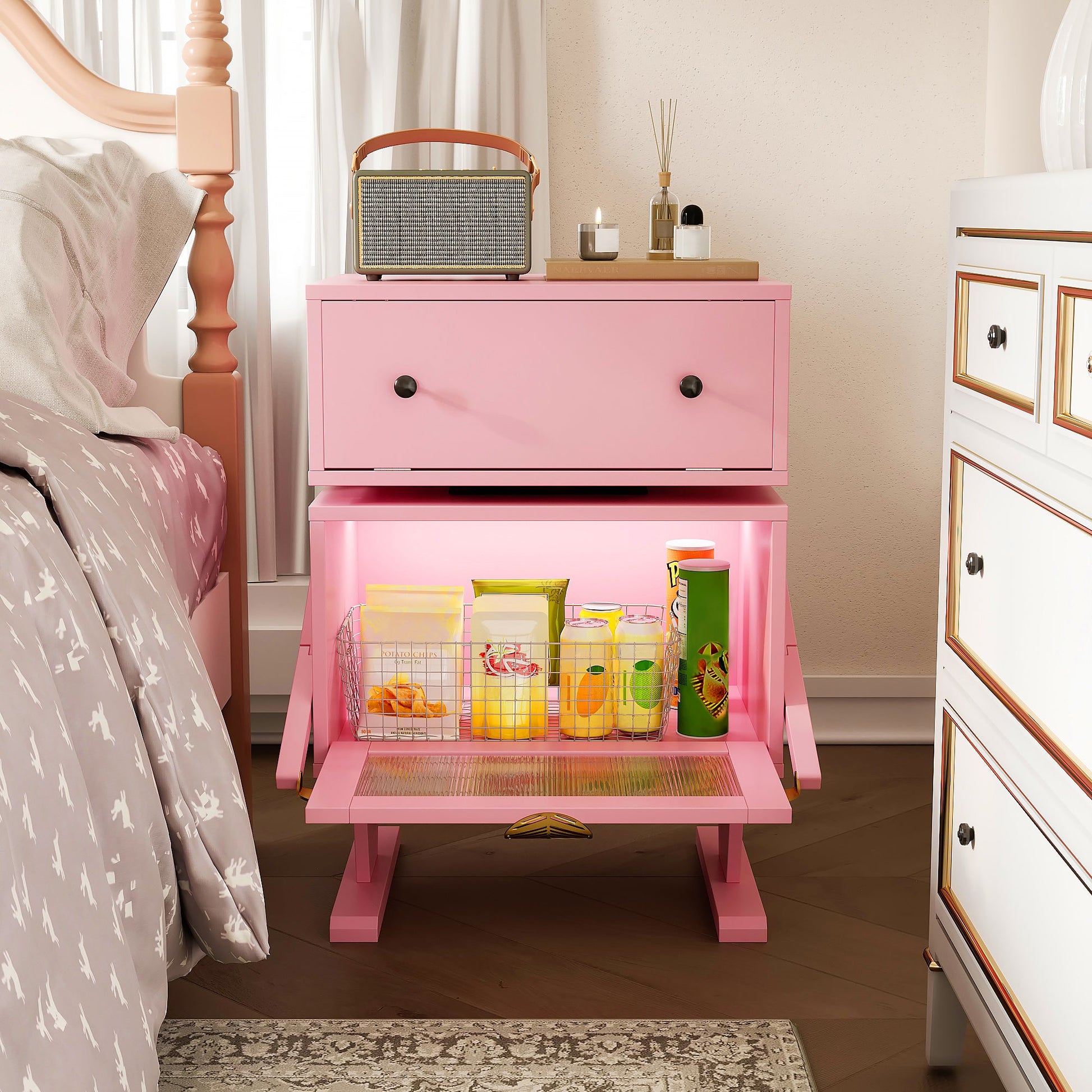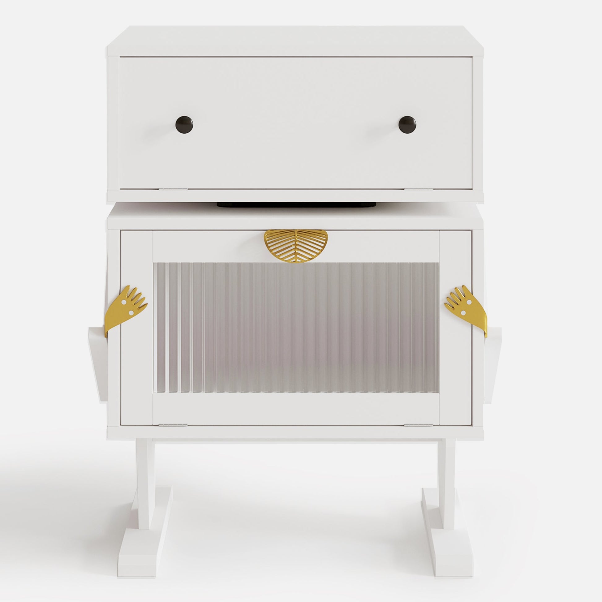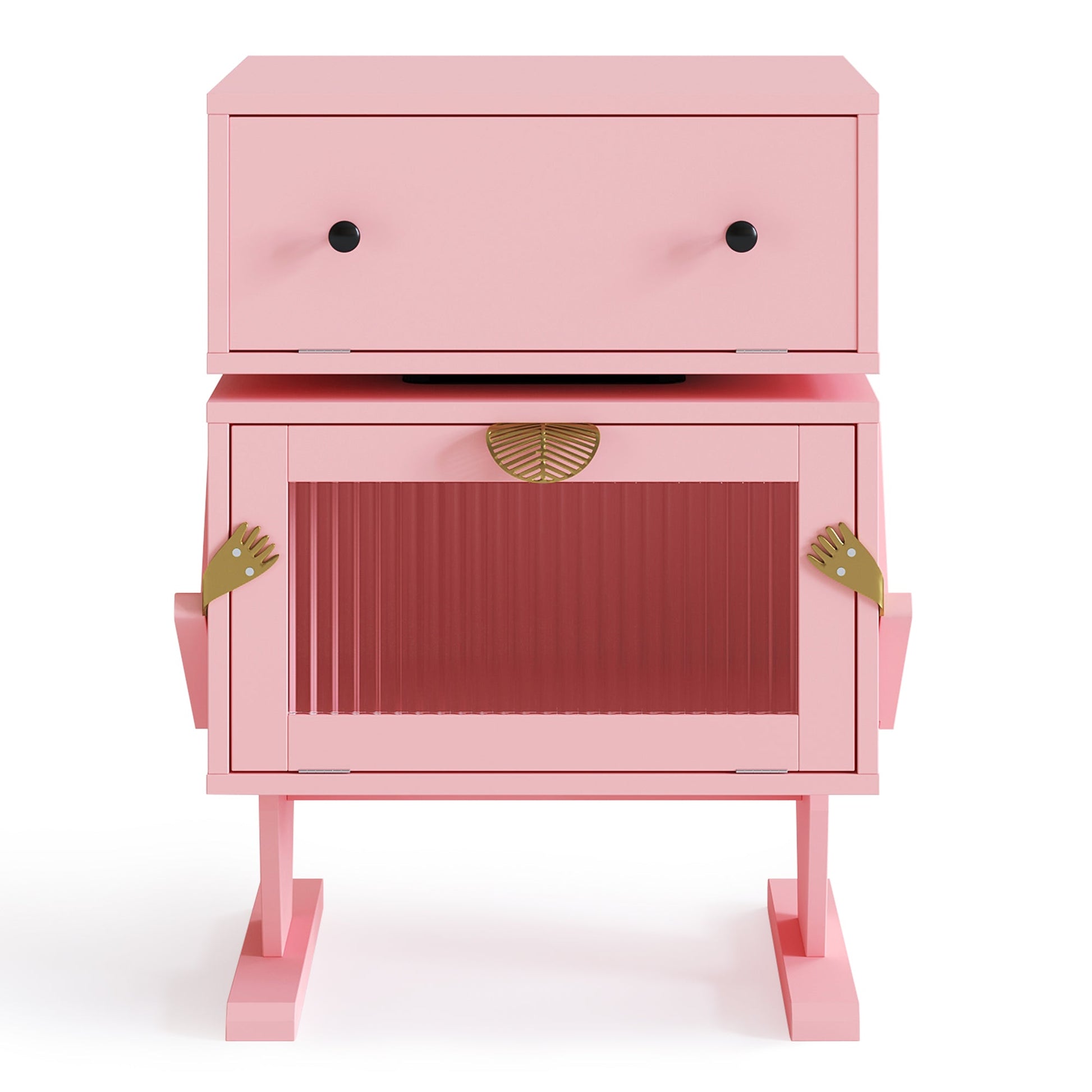 Step into a world of enchantment with our creative nightstand. The rotating head and swinging arms bring whimsy to any room. Ideal for all ages, it seamlessly combines playful aesthetics with functionality. Spacious storage space shines with a 360¡ã rotating top drawer and a smoothly opening lower cabinet, effortlessly storing essentials. The cabinet door transforms into a convenient tray, enhancing daily convenience. Crafted from eco-friendly and robust materials, it offers durability and safety. Creating an inviting atmosphere with the LED light strip design in the lower cabinet, serving as the perfect bedside nightlight. This unique furniture effortlessly transforms into a bedside table, sofa-side companion, or storage cabinet for your home. Elevate your space with this captivating and functional addition.