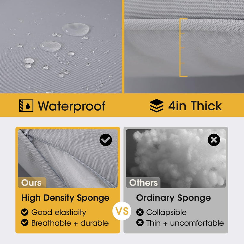 - IMPECCABLE CUSHION- Its 5” high-density foam cushions make it excellent ergonomic back support outdoor furniture! The structural memory foam provides foundation and shape while the cotton ones tend to slag and flatten over time. Wrapped in durable, water-resistant Olefin fabric, the patio furniture sets’ cushions pad both seat and back for ultimate comfort.