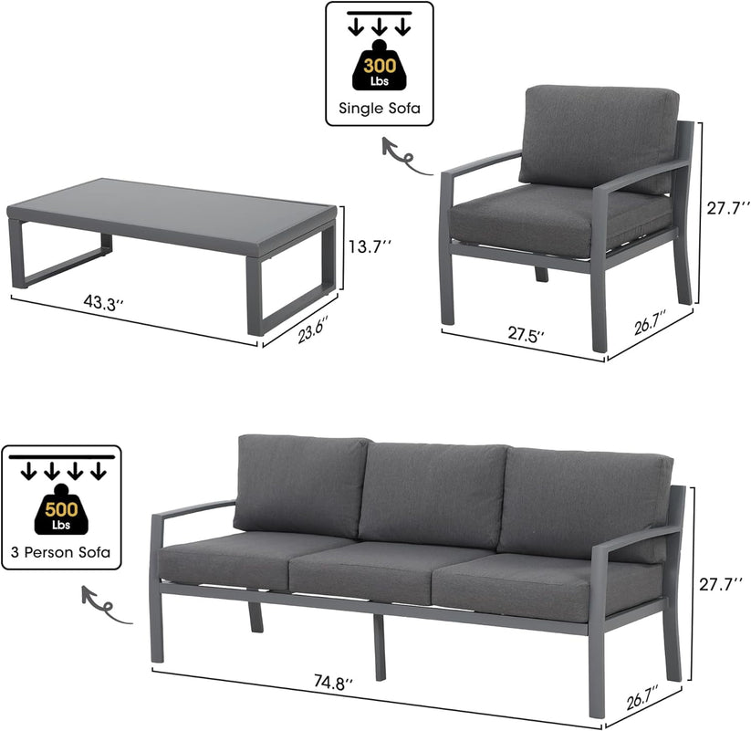 - EASY ASSEMBLY & FUSS-FREE CLEANUP- Just half an hour, our modern outdoor furniture can be assembled quite easily using strong fasteners and handy tools. As for maintenance, the cushions with machine washable zip covers are fast-drying while the heavy-duty patio furniture’s frame and tempered glass tabletop can be rinsed clean.