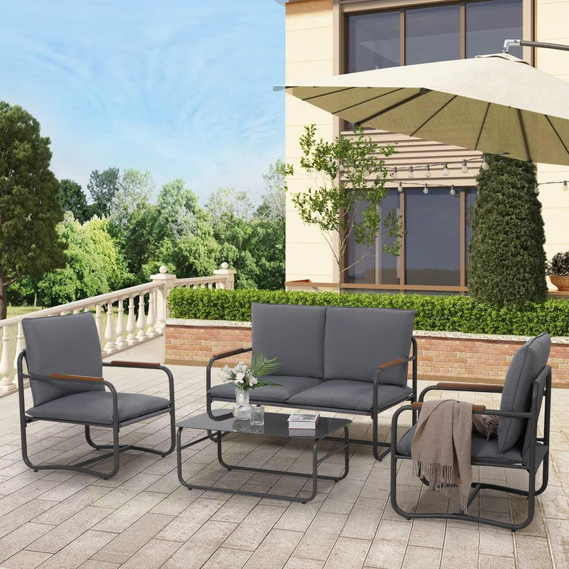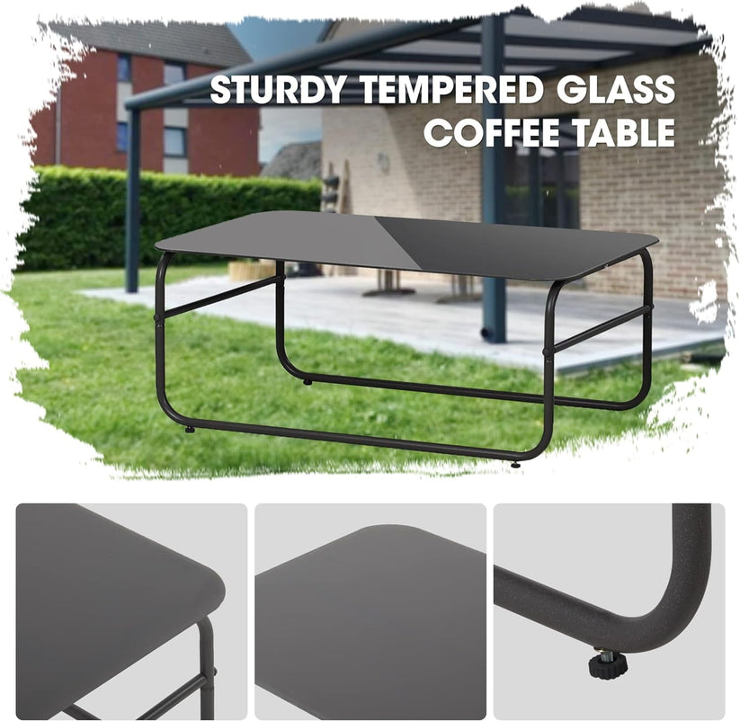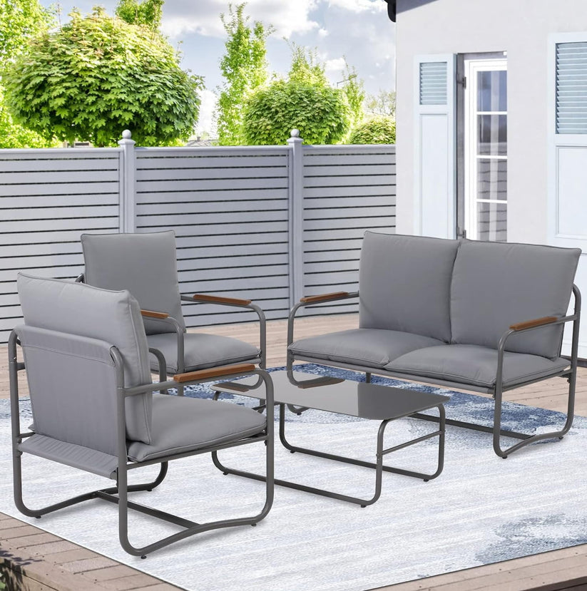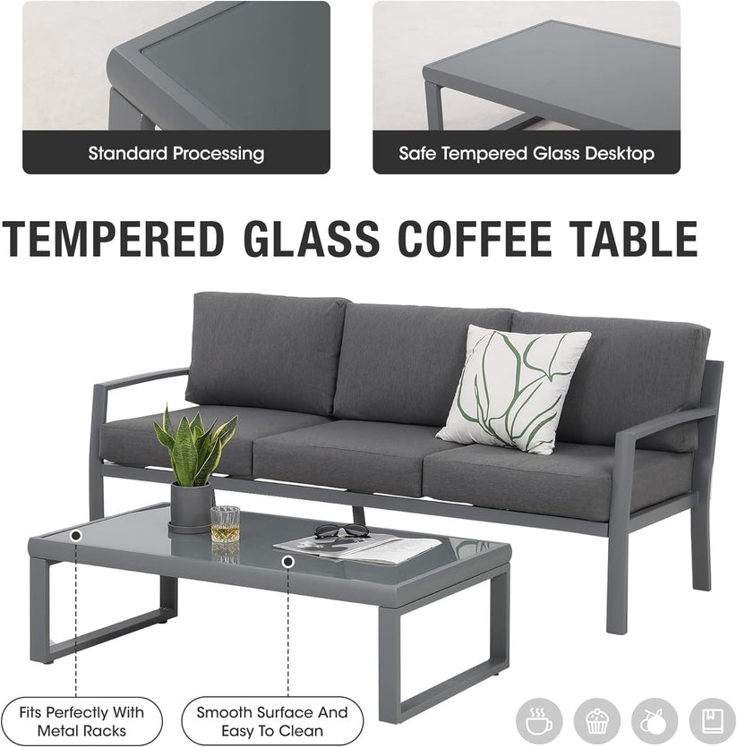 - SLEEK SILHOUETTE- Revitalize your patio or backyard with these patio conversation sets! It showcases a sleek, spacious silhouette and boasts a grey finish. Deep seat cushions, gently-rounded sled legs, and open curved arms round it out in a contemporary style. The coffee table of the patio seating is capped with a tempered glass surface for a cohesive look yet easy to serve on.