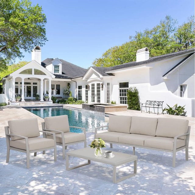 Royalcraft Aluminum Patio Furniture, Outdoor Metal Patio Furniture Conversation Set with Coffee Table, Outside Patio Sofa Sets with Cushion for Balcony Backyard Garden, Beige