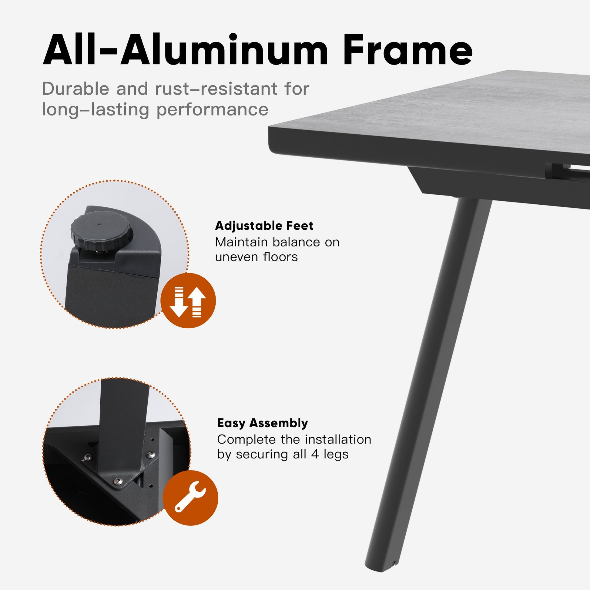 All-Aluminum Frame: Crafted with a lightweight yet robust aluminum frame, this outdoor dining table is resistant to rust and water. Its adjustable feet ensure stability on any surface, making it suitable for various outdoor settings.