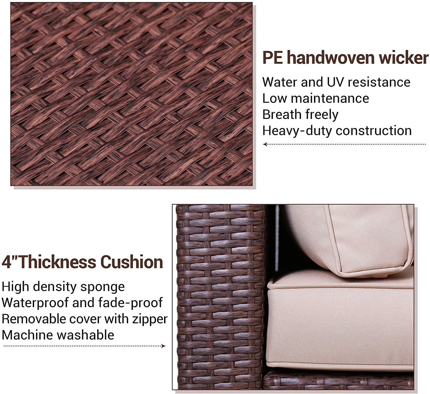 - LONG SERVICE LIFE&FIRM: The rattan of the sofa and the table body is hand-woven and is suitable for all kinds of weather. In addition, our patio sectional sofas are made from aluminum frame to prevent rust when be used outdoors for a long time and cushion cover is made of 250g short-fiber cloth, which is wear-resistant and durable.Longer service life, more stable in outdoor use.