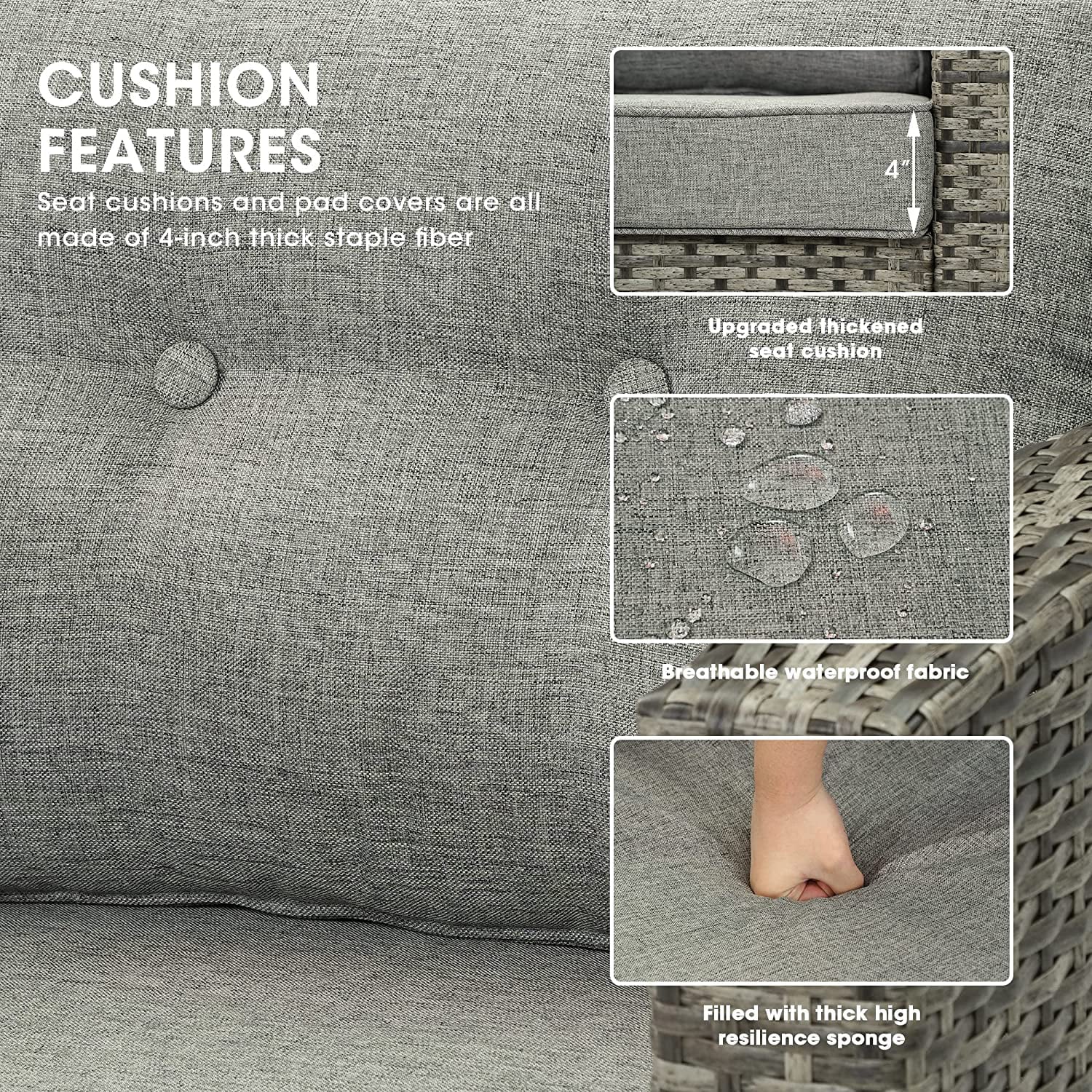 - COMFORT UPGRADE: Our outdoor furniture set is with seat cushions of 3.54 inches , comfort upgrade and have good resilience. And provide proper support, so you won't feel tired after sitting on it for a long time. The seat cushion is very large and wide, providing a lot of space, It can accommodate people of any size to sit on it. Moreover, our sofa is designed with 16" backrest. The design of bent backrest makes you more comfortable to lean on the sofa and enjoy leisure time.