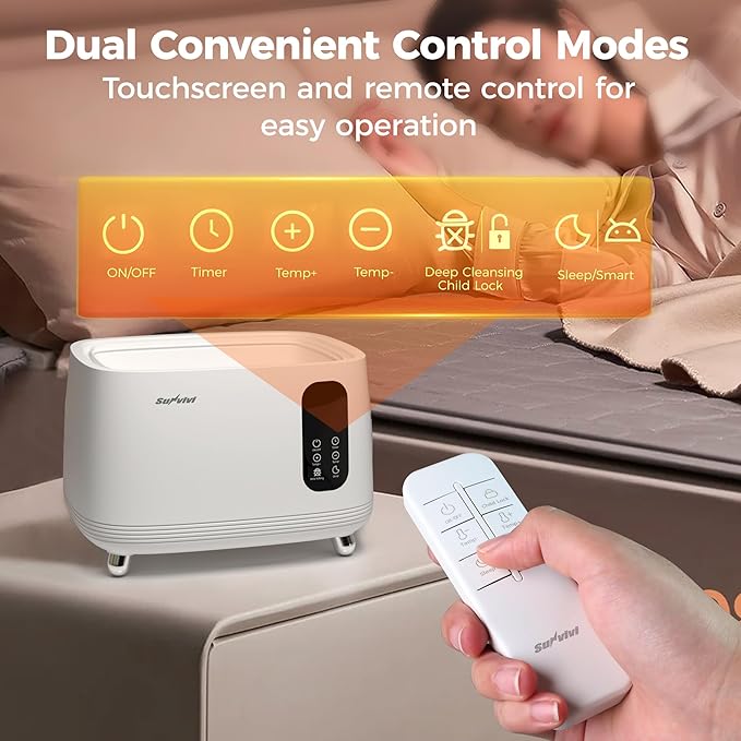 - Effortless Control: Take charge of your comfort with easy temperature adjustments ranging from 68°F to 113°F using the intuitive LED touchscreen or the convenient remote control. Select modes such as timer, sleep, or child lock to tailor the experience to your preferences. The automatic backflow design ensures that 90% of the water returns after shutdown, minimizing the need for manual drainage.