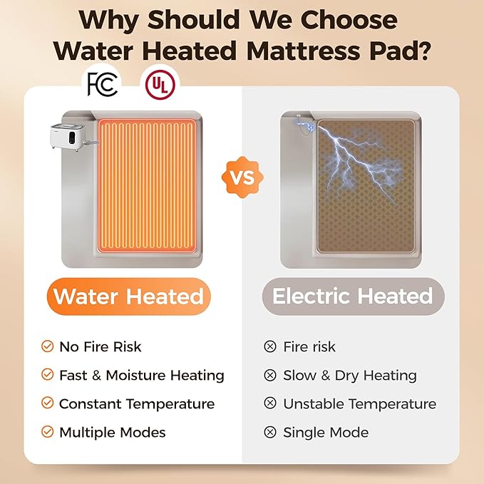 - Enhanced Safety Assurance: Our water heated mattress pad is designed with your safety in mind, boasting FCC and UL certifications. The advanced circulation water heating technology significantly reduces the risks of fire and overheating. With water-electric separation and a quick-insert leak-proof design, we've taken extra measures to ensure top-tier safety.
