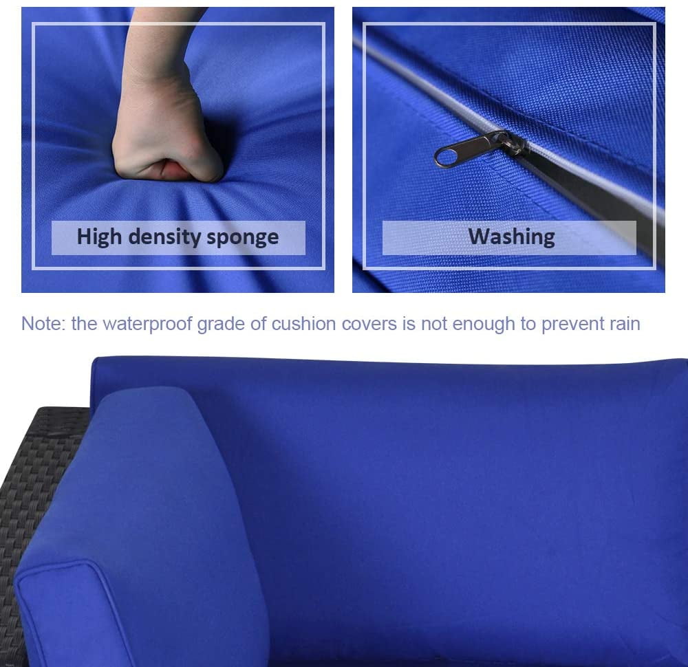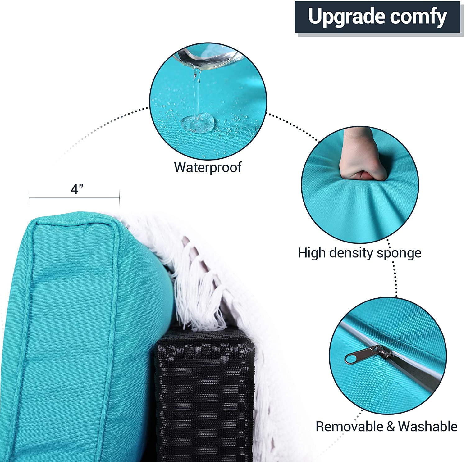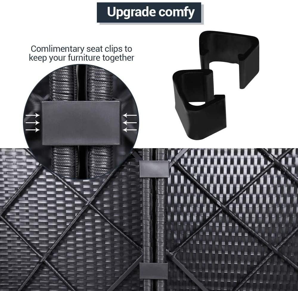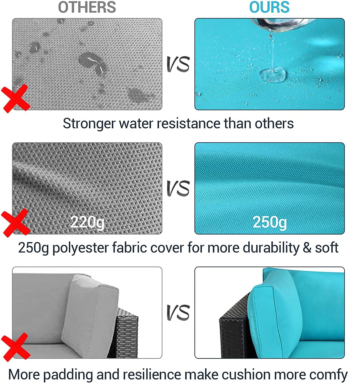 - COMFORT UPGRADE: Our outdoor furniture set is with seat cushions of 3.54 inches , comfort upgrade and have good resilience. And provide proper support, so you won't feel tired after sitting on it for a long time. The seat cushion is very large and wide, providing a lot of space, It can accommodate people of any size to sit on it. Moreover, our sofa is designed with 16" backrest. The design of bent backrest makes you more comfortable to lean on the sofa and enjoy leisure time.