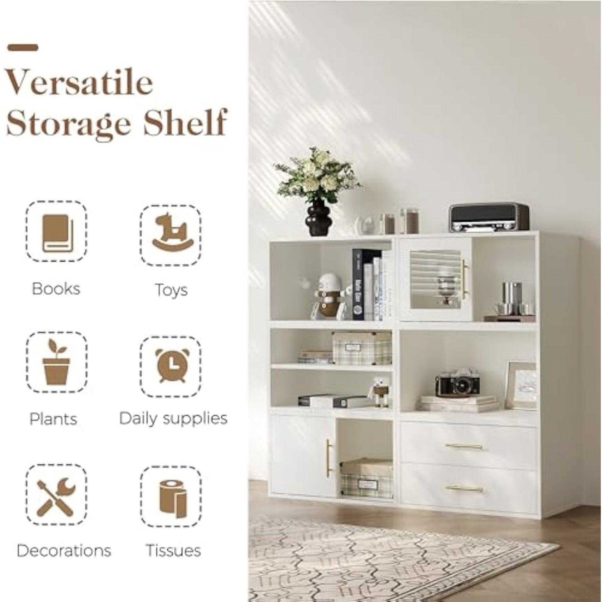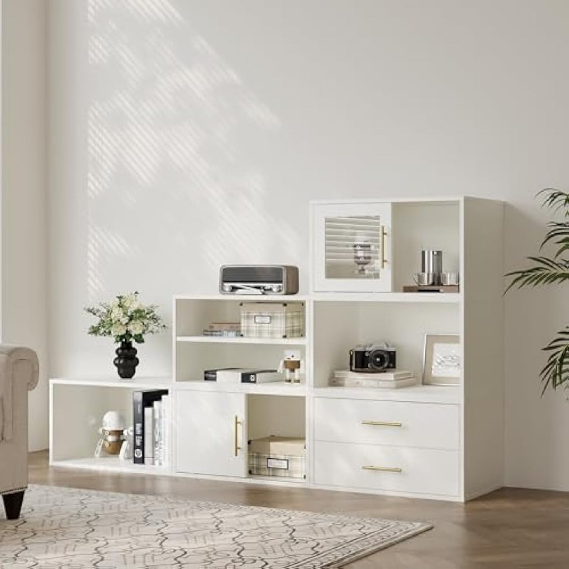 Superjoe 6 Pieces Cube Storage Organizer, Stackable 24" Small Open Bookcase with Drawers, Adjustable Shelf and Sliding Door, White Wood Cubby Storage Shelves for Small Space, Living Room, Bedroom