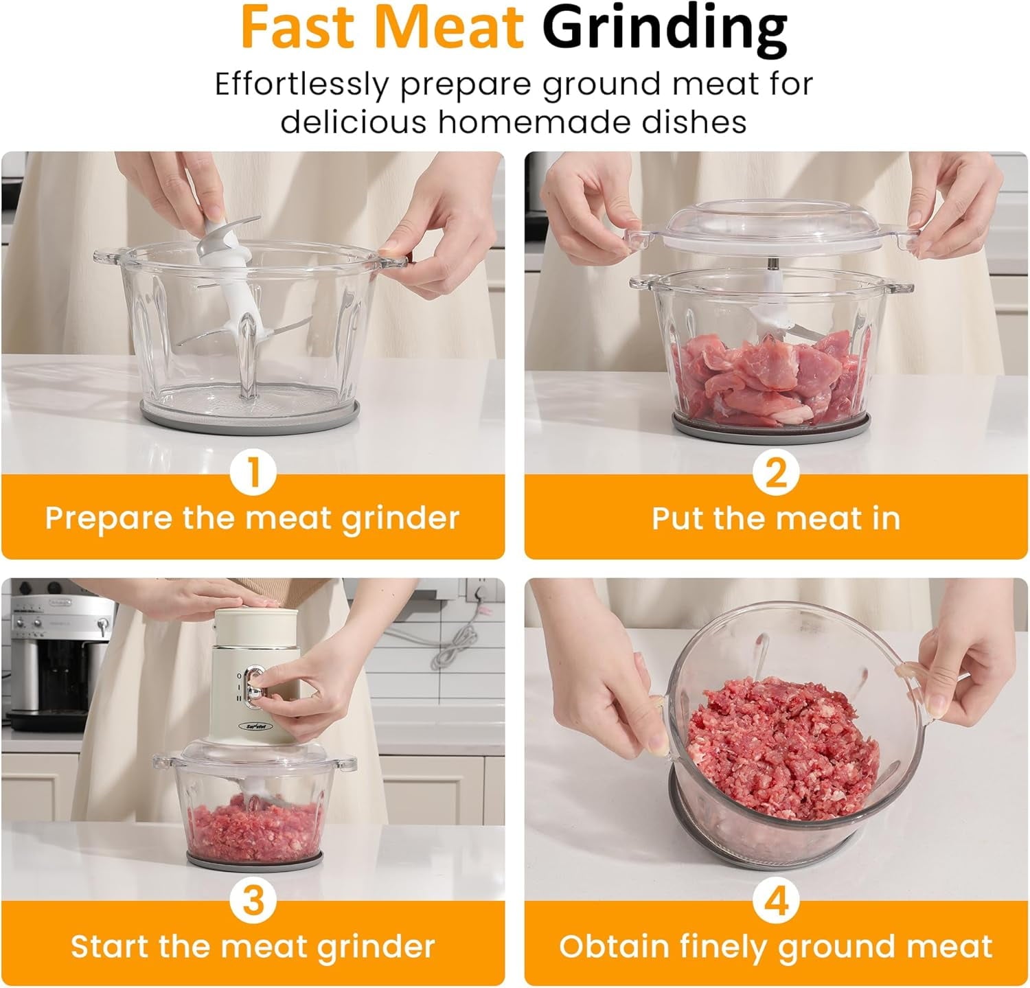 - 【4 in 1 Food Chopper】-This all-in-one appliance combines meat grinding, milling, juicing, and garlic peeling, making it ideal for vegetables, meats, coffee beans, fruits, and more. It replaces multiple single-purpose tools, saving time, space, and money while boosting convenience and efficiency.