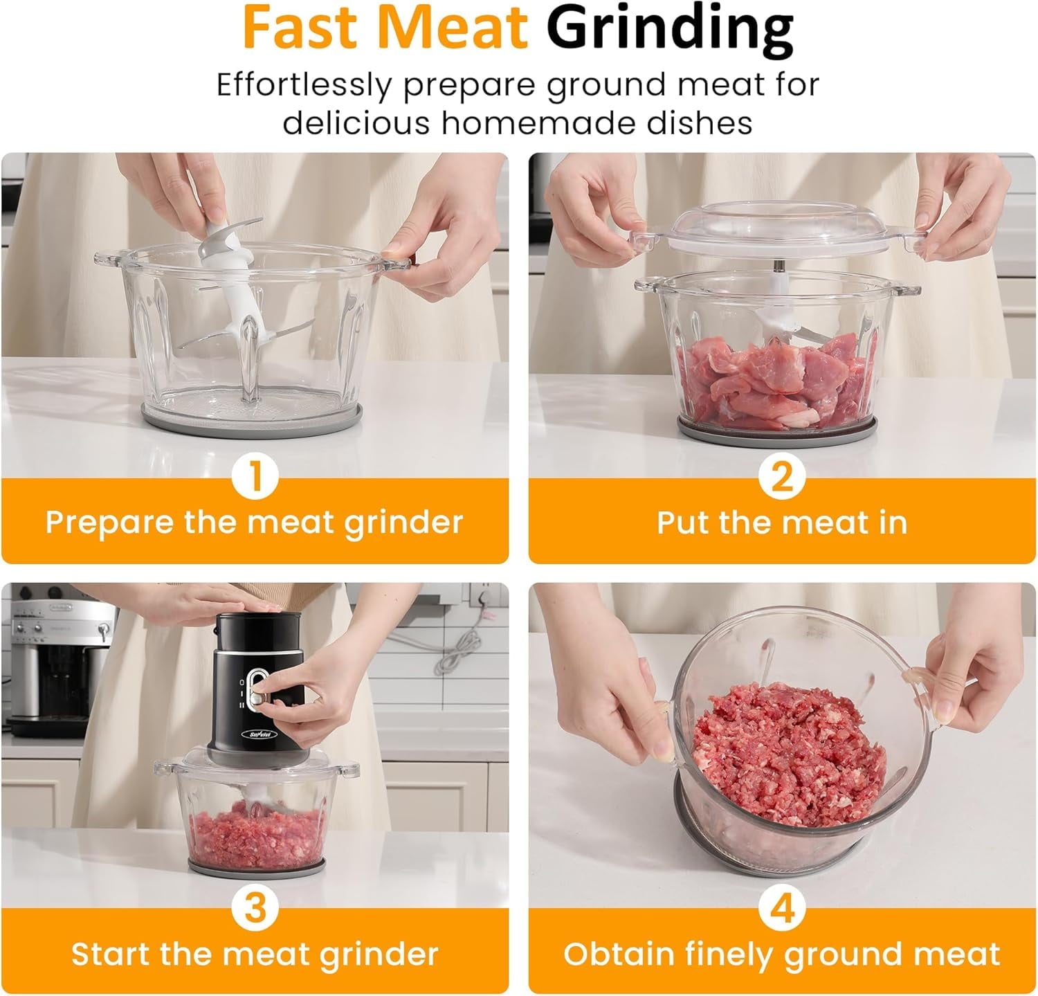- 【4 in 1 Food Chopper】-This all-in-one appliance combines meat grinding, milling, juicing, and garlic peeling, making it ideal for vegetables, meats, coffee beans, fruits, and more. It replaces multiple single-purpose tools, saving time, space, and money while boosting convenience and efficiency.