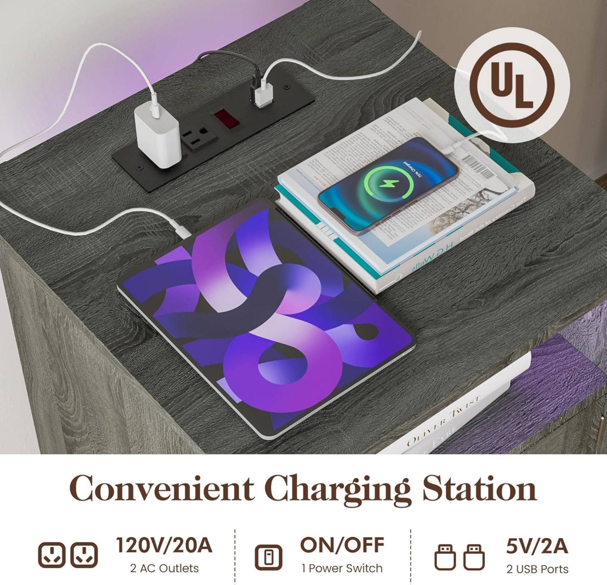 - Charging Station Design: Simplify your life with the built-in charging station on our bedside table. This innovative design includes 1 power switch, 2 AC outlets, and 2 USB ports, allowing you to charge up to 4 devices simultaneously. The 6.6-foot long cord provides ample reach, making it easy to charge your phone, tablet, or lamp right from your bedside. Our side table ensures all your essential devices are always within arm's reach and fully charged.