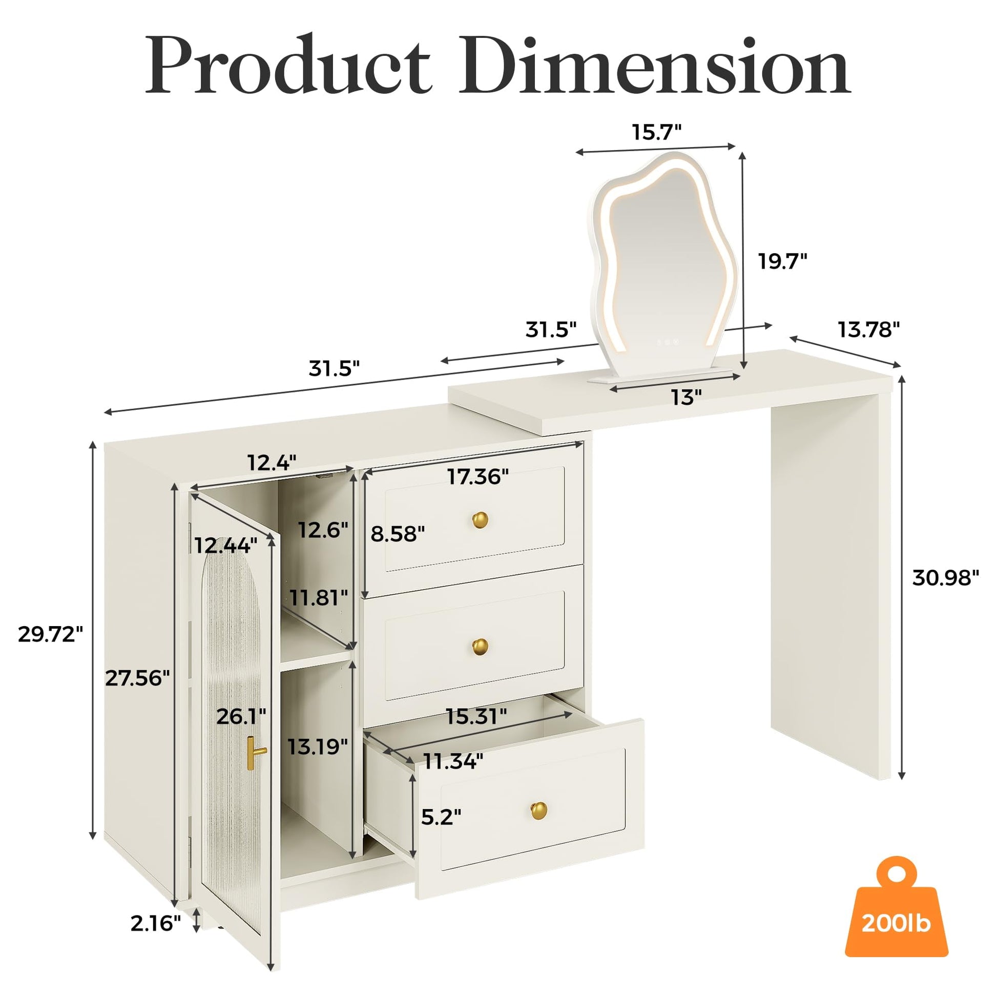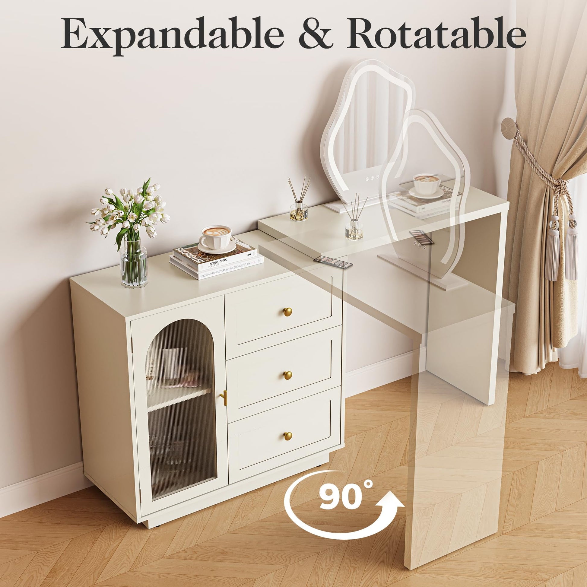 - 【Extendable & Swivelable】: The makeup vanity desk boasts an extendable and swivelable table top, stretching up to 58.8" and effortlessly swiveling 90°. Tailor the length and position of the table to suit your specific needs and preferences.