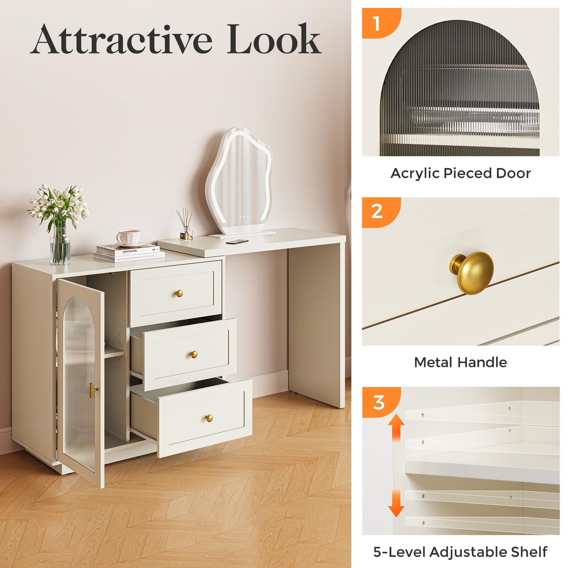 Superjoe Makeup Vanity Desk, Extendable Corner Vanity Makeup Table with 3 Drawers & 1 Door, Modern Dressing Table for Bedroom, Vanities for Women/Girls Bedroom (without Mirror)