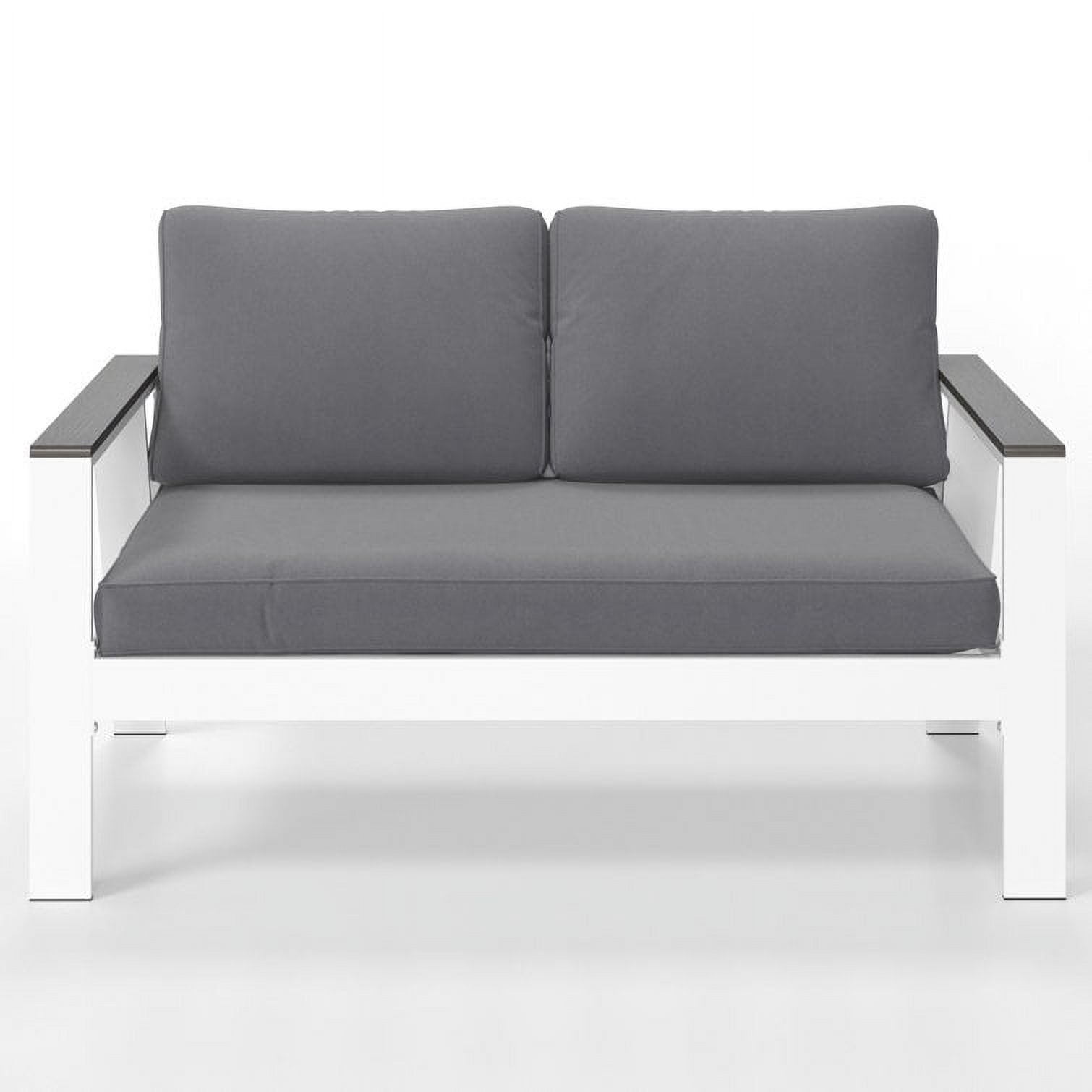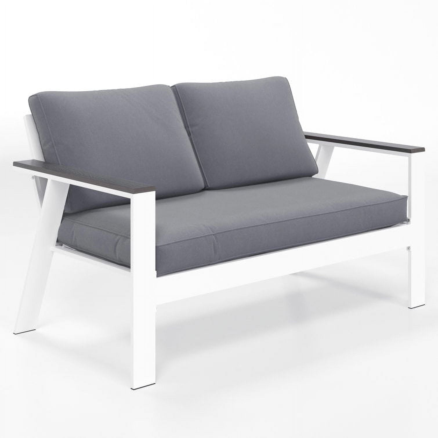 Superjoe Outdoor Aluminum Patio Loveseat Sofa Furniture, Metal All-Weather Modern Patio Sofa Loveseat with Wood Accent Armrest and Angled Backrest, White