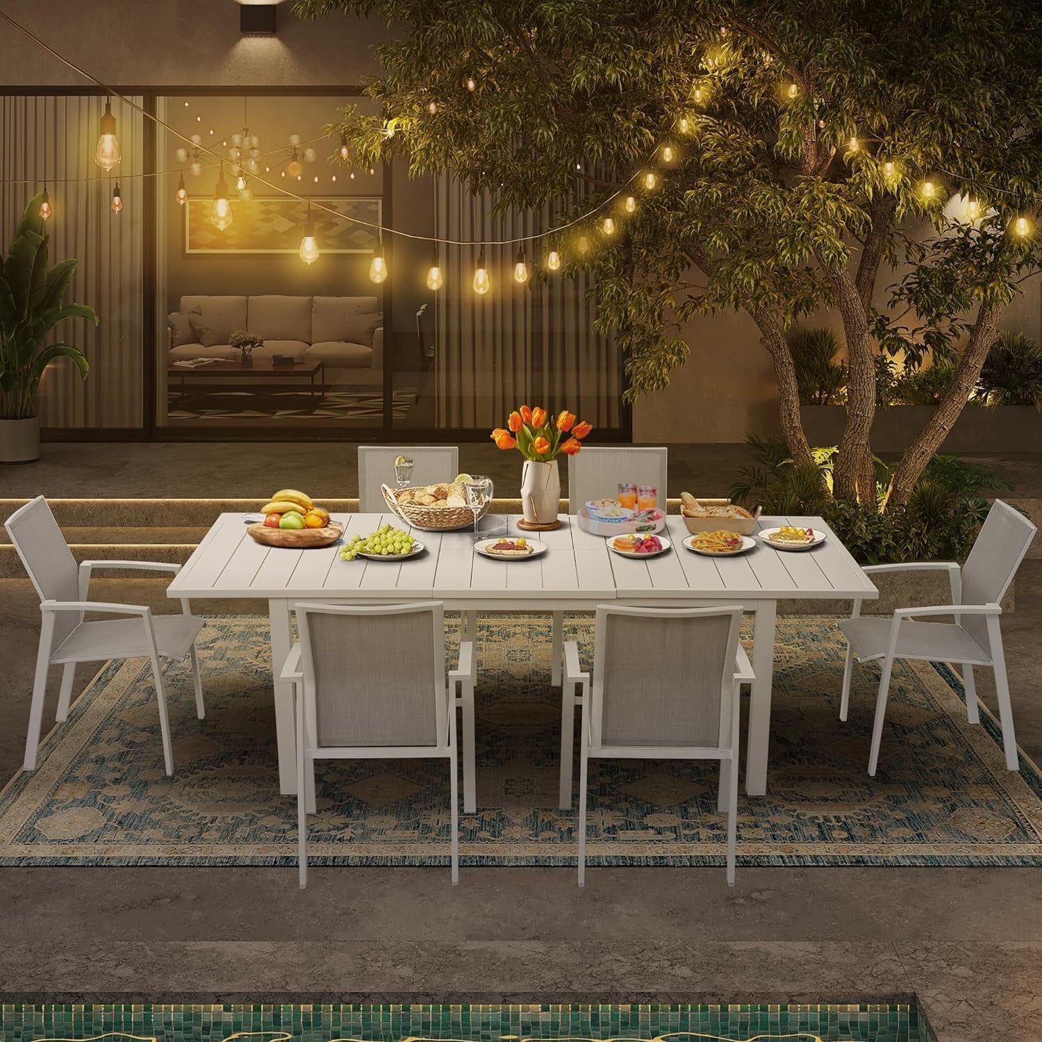 Enhance your outdoor dining experience with Superjoe outside aluminum dining set. Designed for both durability and style, the aluminum frame is equipped with a weather-resistant powder coating, while the Texilene mesh seating provides unparalleled comfort due to its breathable, quick-drying, and waterproof properties. The metal expandable table smoothly extends to accommodate up to 8-10 guests, and the chairs' ergonomic design ensures comfort. With straightforward assembly and minimal maintenance requirements, this patio table and chairs are ideal for intimate gatherings or grand events, transforming your outdoor space into the ultimate destination for memorable meals with family and friends.